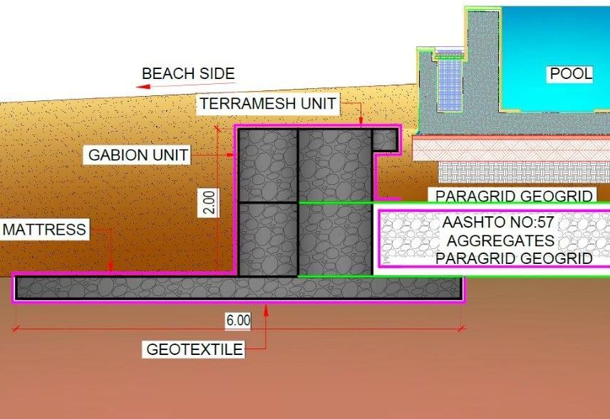 The contractor approached Maccaferri Middle East to propose an alternate protection solution. Maccaferri proposal consisted of (1) retaining wall & (2) scour protection functions. For the retaining wall function, a 2m high Terramesh wall was chosen. As primary soil reinforcement, geogrid type ‘Paragrid 100’ was considered for the pool’s entire base. For the scour protection function for extreme storm events, additional gabion mattresses and sacrificial gabions were considered surrounding the Terramesh retaining wall. Considering a maximum scour of 2.5m from an extreme storm event, a width of 4m was proposed for the gabion mattress apron. Maccaferri solution avoids the above-mentioned disadvantages of the original secant pile wall option. Based on the techno-commercial evaluations, the Maccaferri solution was chosen by the client after critical review and approval by the designer.