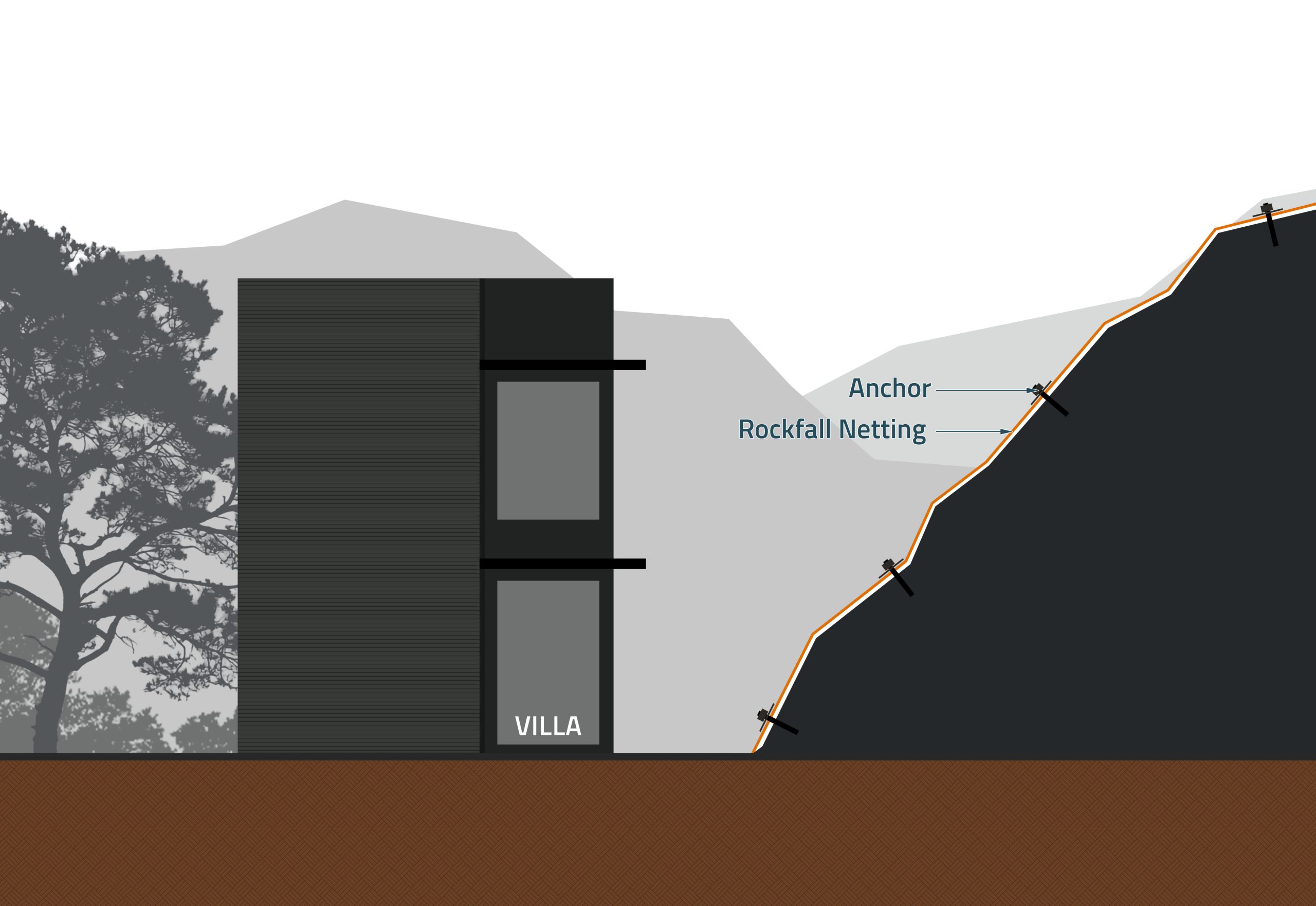The primary challenge was safeguarding this critical, high-value infrastructure from the continuous threat of natural slope instability and rockfall events. The steep, exposed rock faces directly above and adjacent to the palace structure and access roads posed a significant risk of loose rock fragmentation, and any failure could lead to catastrophic damage to the palace and its surroundings. The extreme desert climate (high UV, significant temperature variations) demanded materials with superior longevity and corrosion resistance, while the location’s high-security nature meant the installation needed to be efficient, minimize disruption, and be visually discrete.