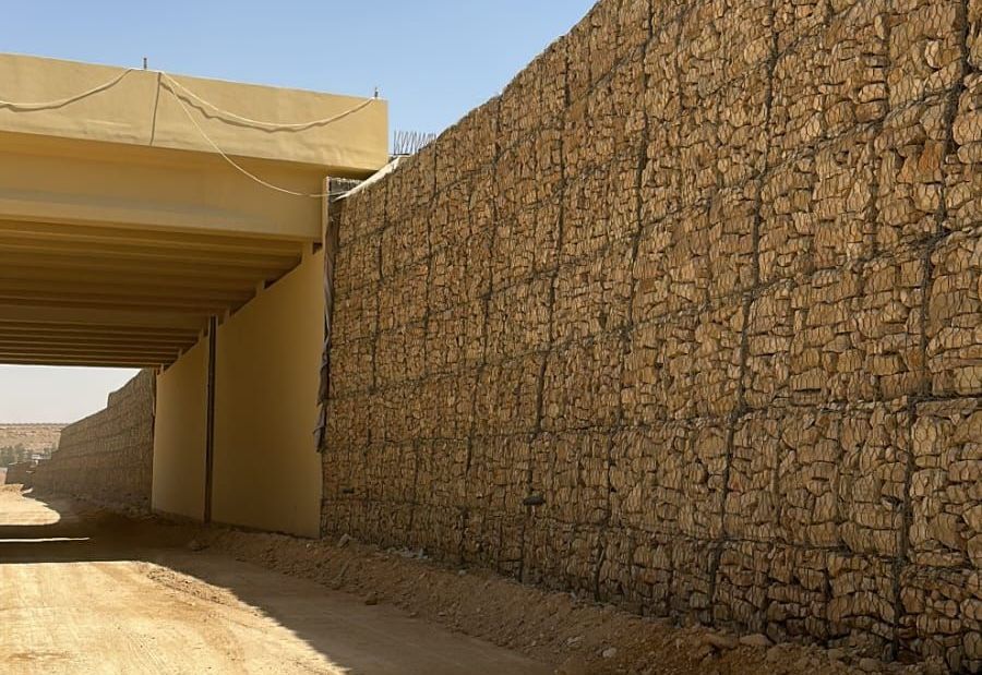 To address the multifaceted challenges of the Wadi Hanifa protection project, Derrah Properties engaged Maccaferri Middle East to propose a suitable solution. Maccaferri recommended the use of a Terramesh Mechanically Stabilized Earth (MSE) wall system, which combined structural robustness with aesthetic appeal. The gabion-faced Terramesh system was designed to act as a durable retaining wall while also addressing the scour protection requirements with its 2-meter-deep embedment, exceeding the estimated scour depth of 1 meter. To enhance the wall’s visual integration with the surrounding landscape, the gabion face was filled with locally sourced limestone from Wadi Hanifa, ensuring a natural appearance. For soil reinforcement, Maccaferri utilized BBA-certified Paragrid HF geogrid, known for its superior resistance to installation damage, even with challenging rock-fill backfill. Additionally, a MacDrain geocomposite drainage layer was installed behind the wall to facilitate efficient internal drainage, preventing water accumulation and enhancing long-term stability. Maccaferri Middle East provided a comprehensive scope of services, including design, material supply, and construction assistance.
