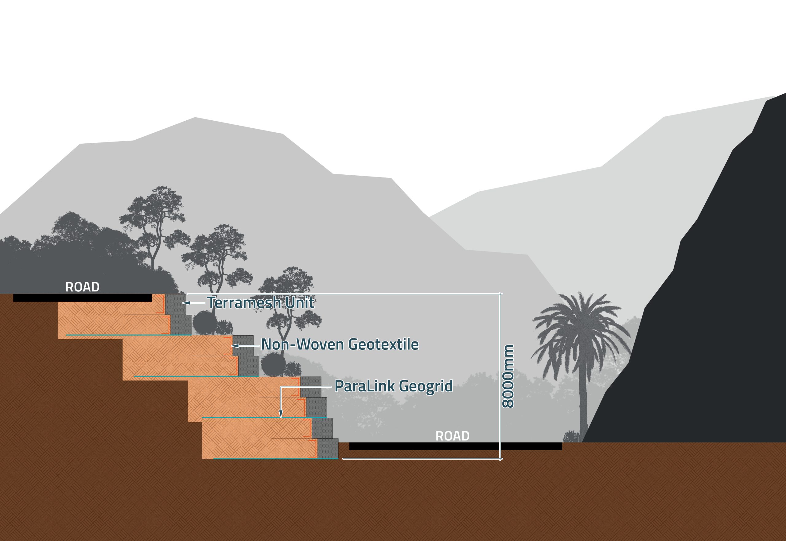 The chosen solution to mitigate these issues is the implementation of the Terramesh system, a robust, modular earth retention technology developed by Maccaferri. The system utilizes durable double-twisted steel wire mesh units that form a strong front facing, combined with integral mesh panels extended into the backfill, this facing is reinforced with high-strength Paralink geogrids layered horizontally into the backfill, creating a massively stable, composite reinforced earth structure designed to withstand flash floods and stabilize the slopes long-term.