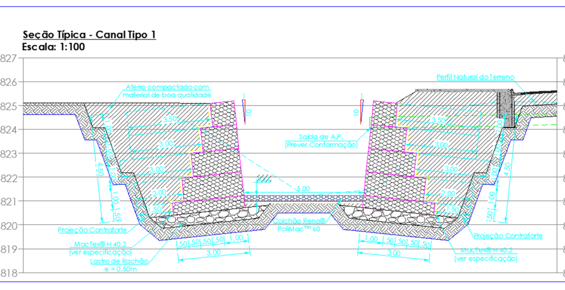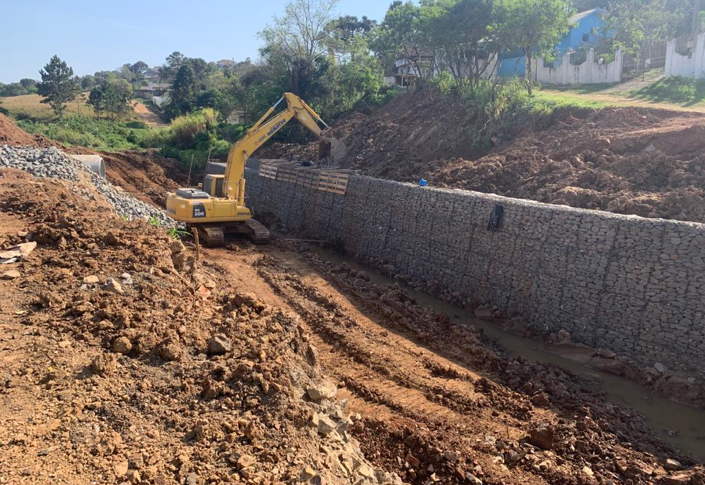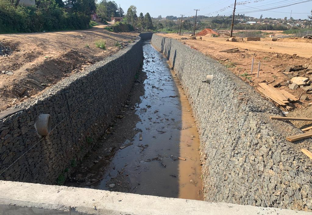 Para as obras no córrego, foram utilizados gabiões para o arroio existente no local com o objetivo da estruturação das encostas e contribuição para a conservação do córrego, com a estabilização da margem. Com o objetivo de garantia em relação a vida útil das telas, foi adotado o revestimento Polimac tanto nas telas de Gabiões Caixa como dos Colchões Reno e arames de amarração. No trecho a montante e trecho final foi projetado um canal retangular devido a restrição de espaço. Já no meio do canal foi utilizado um canal trapezoidal.