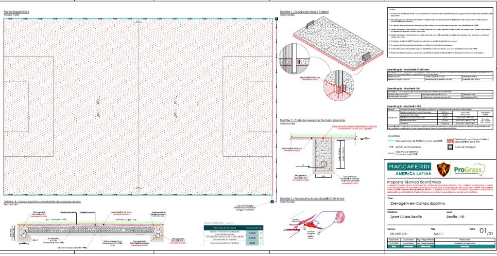 A reconstrução do sistema de drenagem foi a primeira etapa, usando o geocomposto MacDrain® pela rápida instalação, essencial para acelerar o cronograma. O MacDrain® 2W foi escolhido por sua alta capacidade de drenagem e amortecimento, atendendo às necessidades do clube. Essa escolha permitiu maior velocidade na execução, redução de outros insumos e capacidade drenante superior aos sistemas tradicionais.