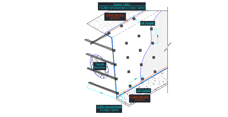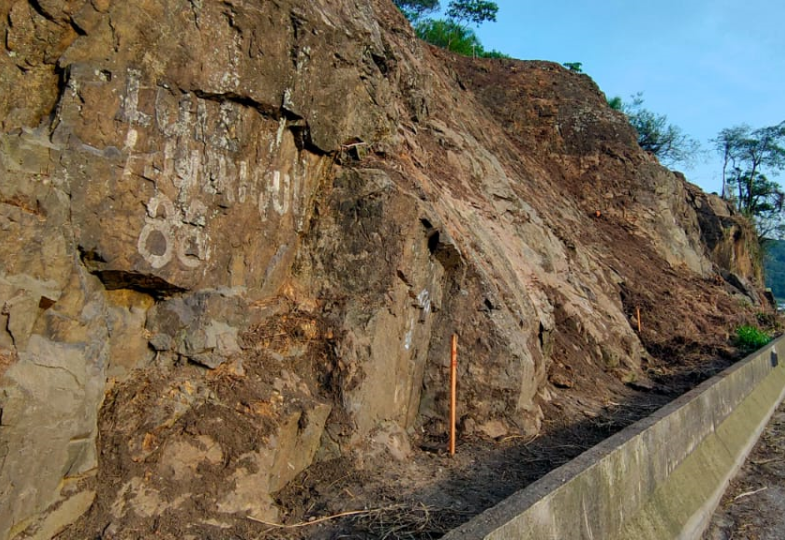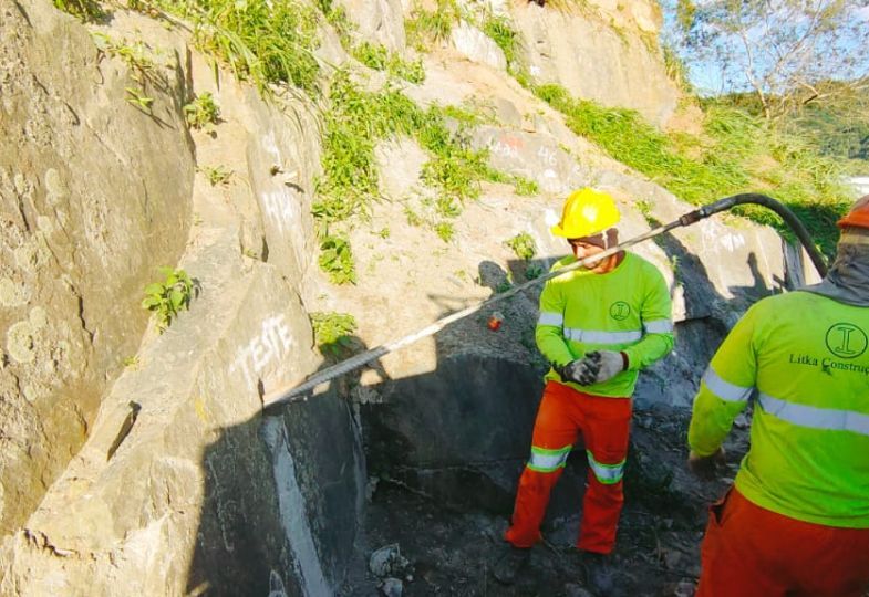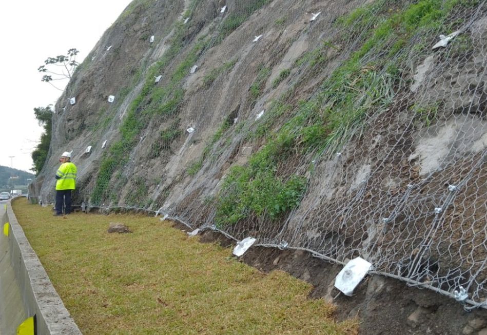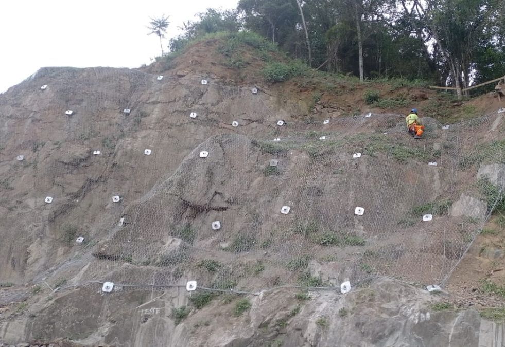 Os trabalhos consistiram na remoção do material instável e estabilização do talude Rochoso com revestimento cortical Tela Steelgrid HR 50 e grampeamento.