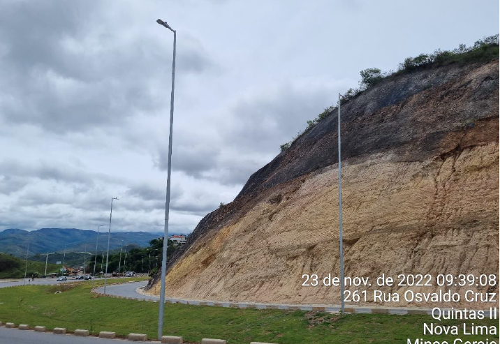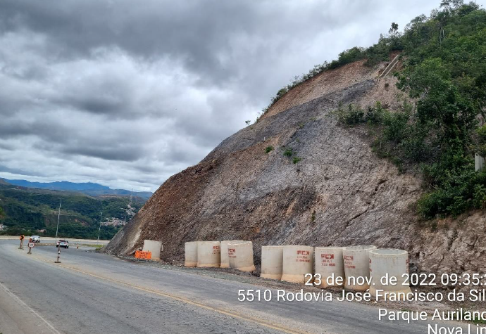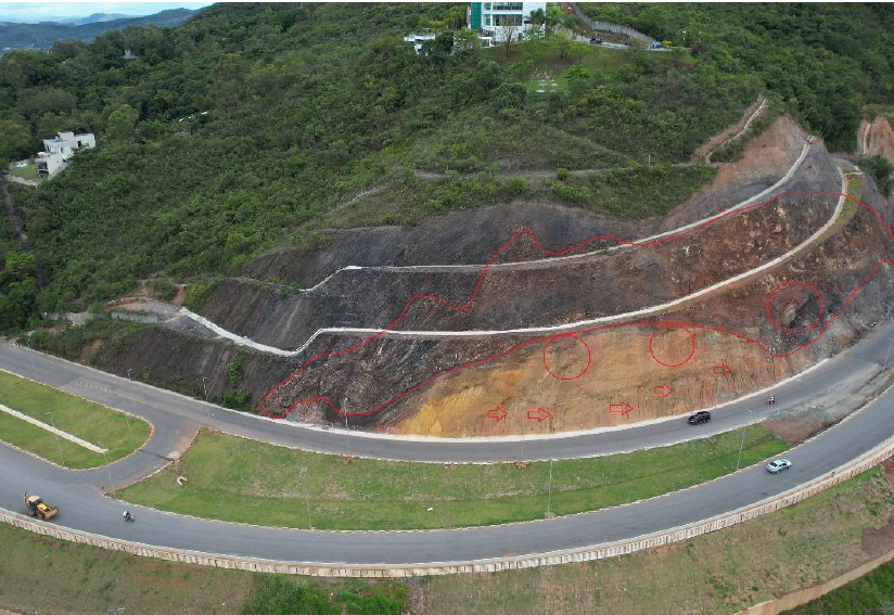 A Prefeitura de Nova Lima enfrentava um desafio crítico relacionado à estabilidade dos taludes da rodovia, que vinham causando riscos consideráveis aos motoristas e comprometendo a segurança da via. Esses taludes possuíam grandes áreas com inclinações elevadas e estavam localizados em uma zona geológica de falha, o que agravava a situação devido à presença de uma extensa camada de rocha fraturada. Essa camada era particularmente vulnerável a colapsos progressivos, com a possibilidade de deslizamento de lascas e pacotes de solo que poderiam cair sobre a base do talude e atingir a via.