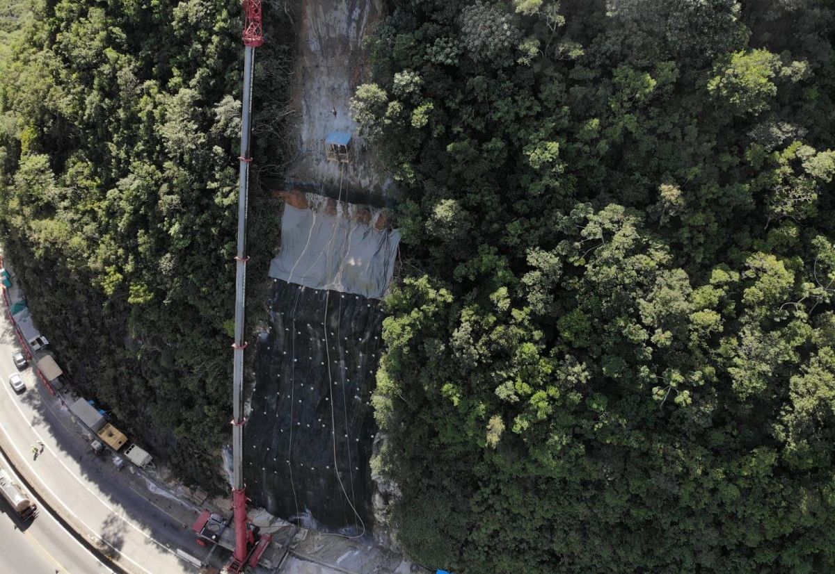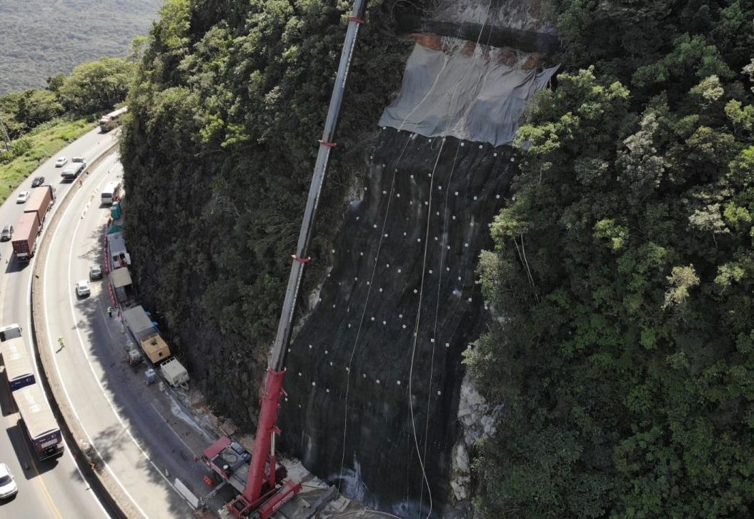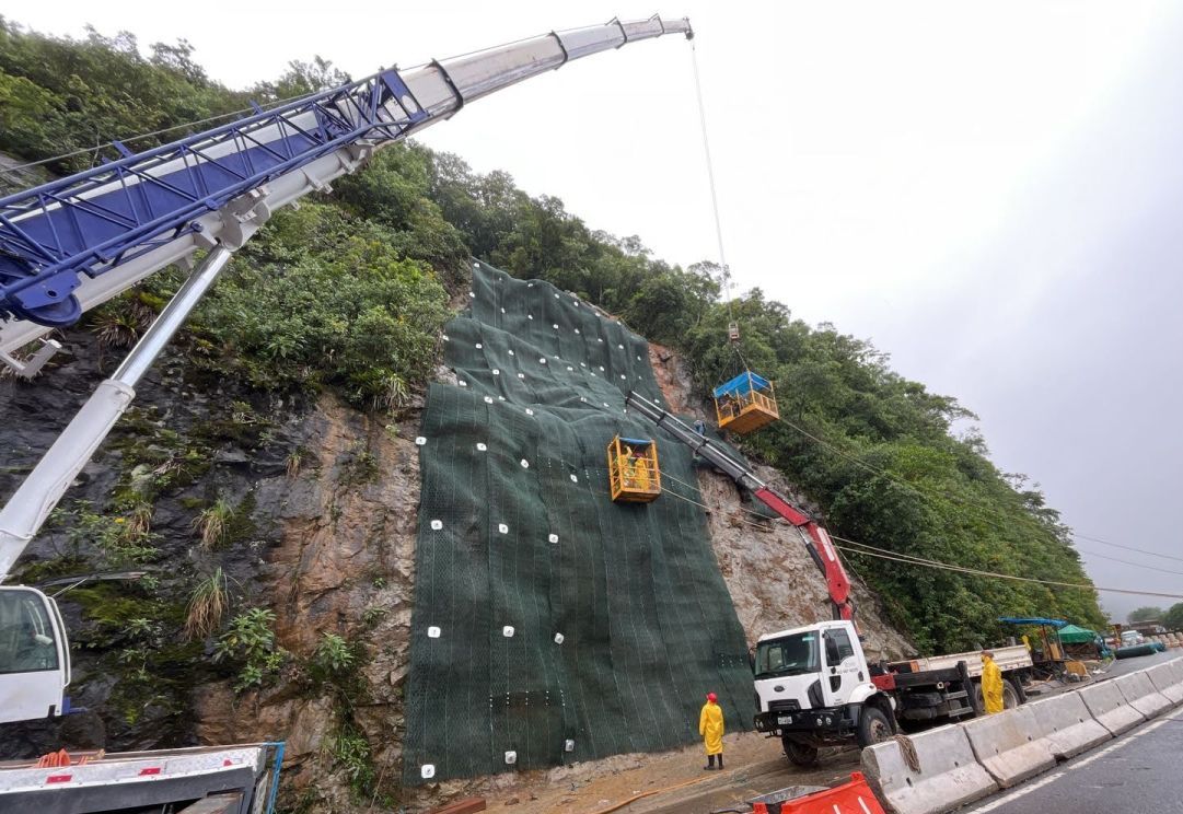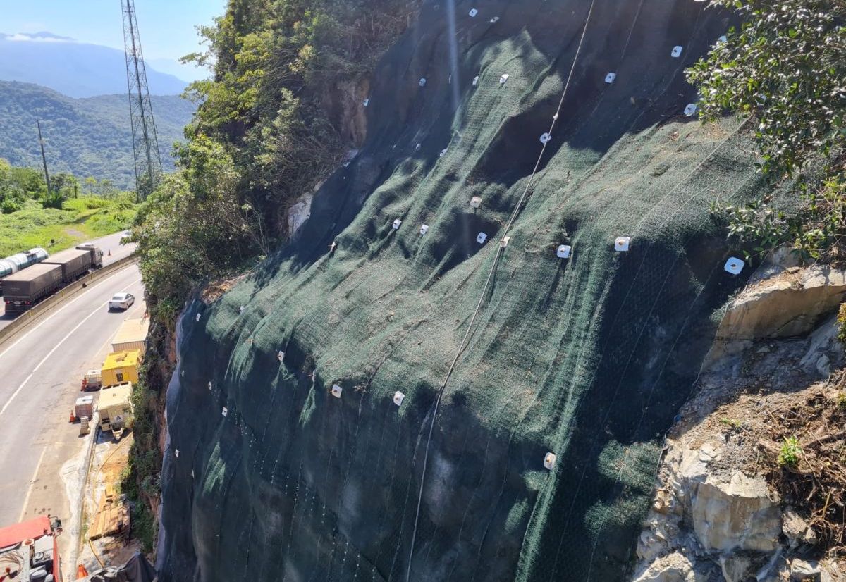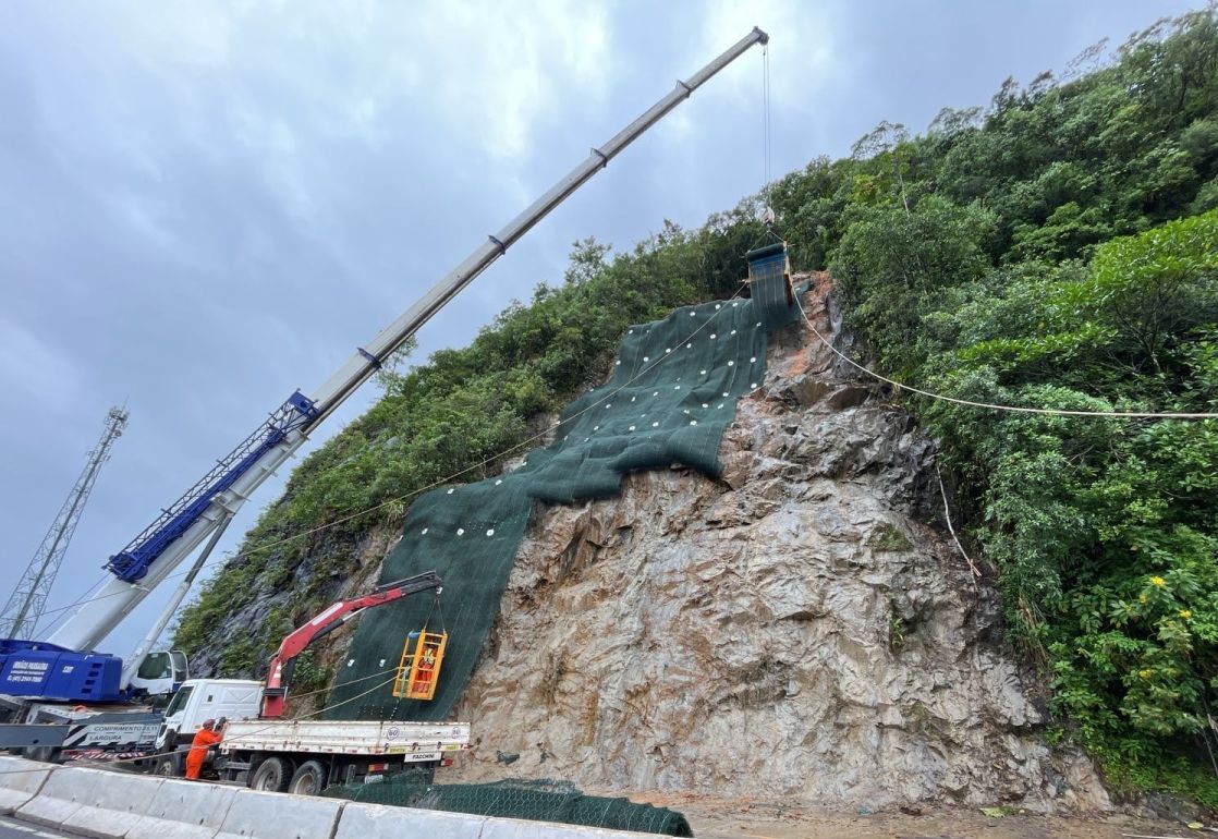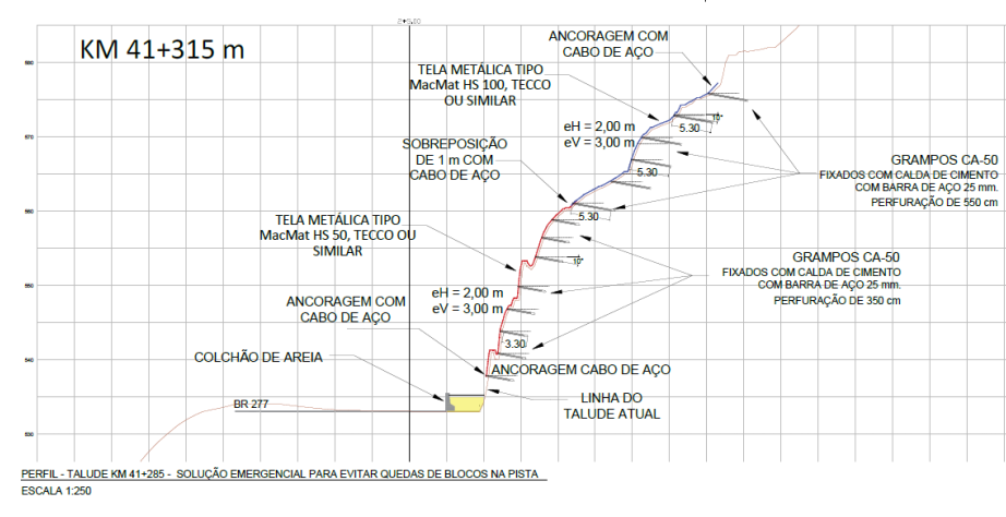 Primeiramente foi feito uma lavagem total da encosta com uso de caminhões pipa com o intuito de não somente avaliar a situação real mas também para carreamento de possíveis materiais soltos. Em seguida, após feita a análise de topografia, mapeamento geológico e sondagens foi proposto pontualmente a situação ocorrida a solução na área rochosa do talude com a perfuração de grampos e instalação da tela MacMat HS 50 na porção inferior e logo acima da primeira berma o MacMat HS 100.