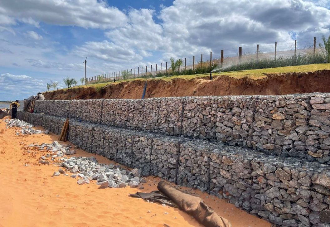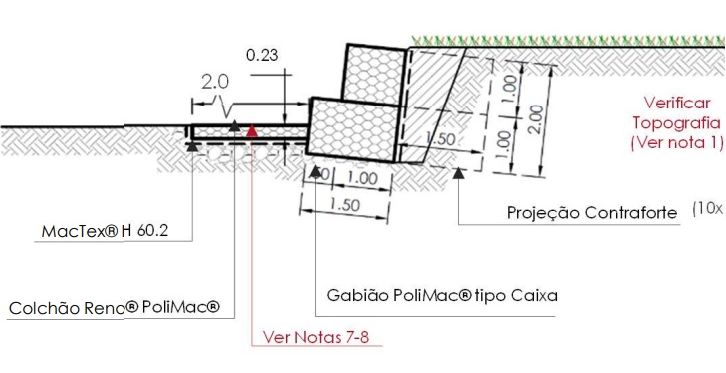Para evitar o transporte de material em função da elevação do nível do rio, foram empregadas estruturas de Gabiões Caixa, a fim de prevenir processos erosivos e a instabilidade do solo devido ao solapamento, assegurando, assim, a integridade do empreendimento.