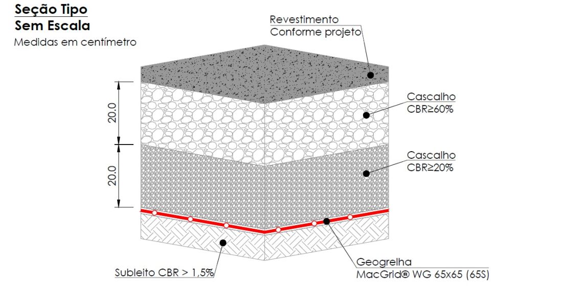 Foi proposta uma solução que envolve o uso de geossintéticos, substituindo o método convencional de agulhamento com rachão. Após um estudo aprofundado do caso, a seção do pavimento foi dimensionada com a aplicação de uma camada de MacGrid® WG 65×65 sobre o subleito, proporcionando maior segurança e otimização dos custos da obra.