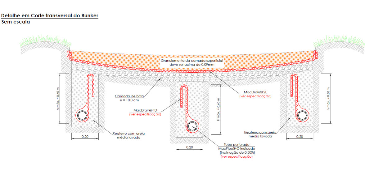 Foi proposto a execução de um novo sistema de drenagem com trincheiras drenantes (MacDrain TD). Para otimizar o desempenho, também foi considerado o uso de um colchão drenante com MacDrain 2L. O sistema foi projetado para captar as águas que infiltrem nos bunkers de areia e direcioná-las para caixas de passagem, que conduzirão o fluxo ao sistema de drenagem pluvial do condomínio, garantindo uma solução eficiente e rápida para o escoamento da água.
