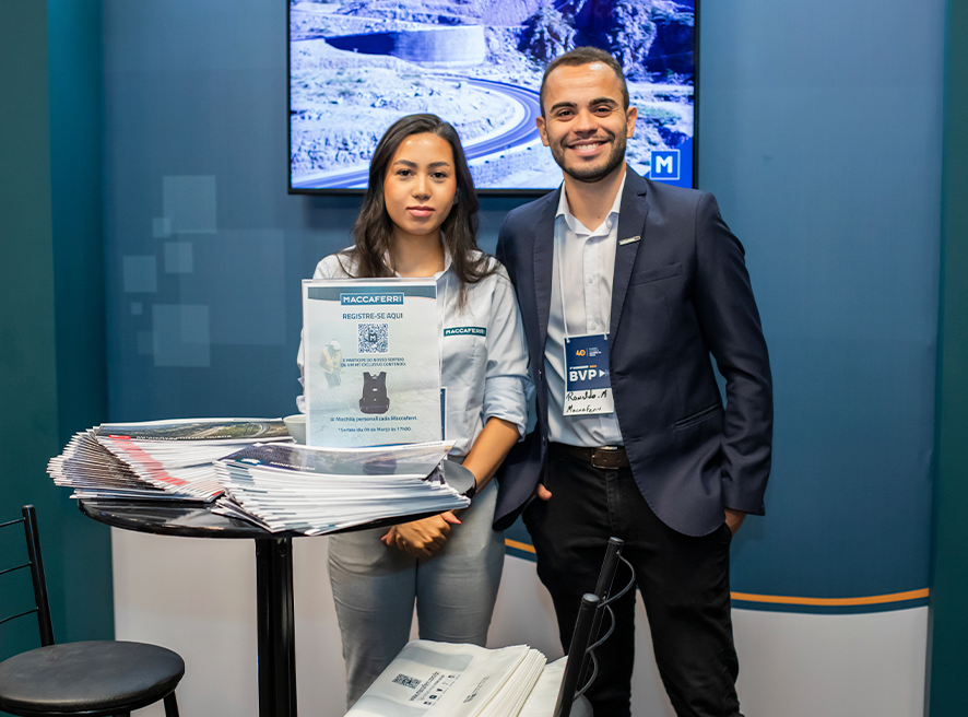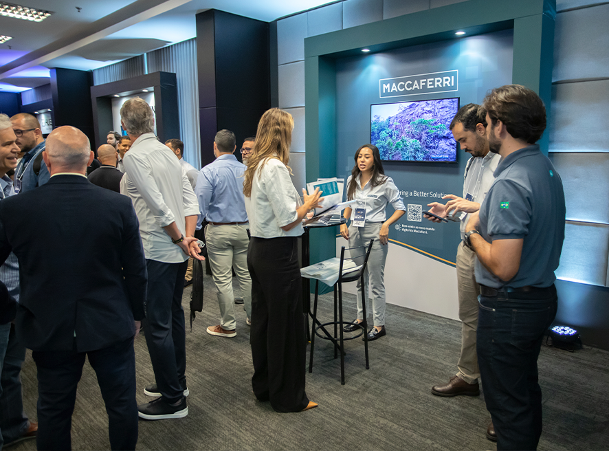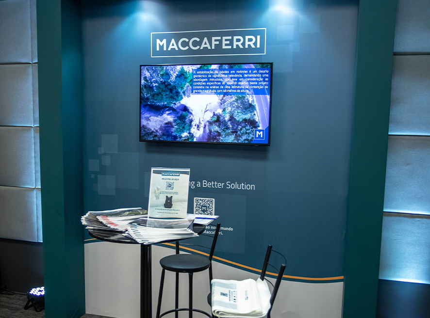 Durante o workshop, a Maccaferri esteve presente com um stand dedicado, onde apresentamos nossos catálogos de soluções geotécnicas para a mineração, além de promover conversas técnicas com profissionais interessados em inovação, segurança e eficiência em projetos geotécnicos.