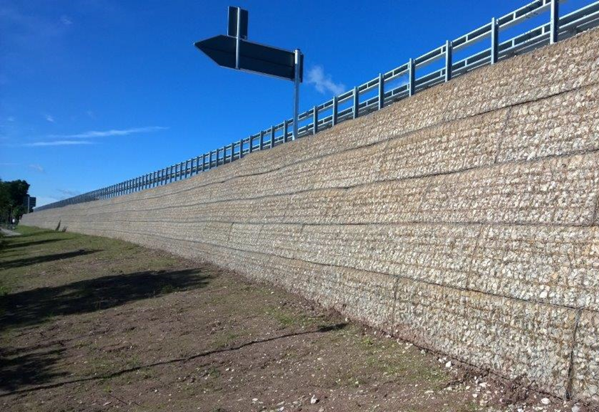 Maccaferri through his local partner BECO Bermüller proposed a reinforced soil structure made by modular elements of Green Terramesh 70°. The typical section was 7 steps of 0,76m, at a total height of 5,32m. One of the reasons for the choice was the possibility to cover the visible surfaces with green natural vegetation, in order to integrate well the structures in the landscape, but during the construction, the soil appeared to be too sandy and of bad quality. The contractor then decided to fill the front with stones in order not to have erosion problems due to rainwater flow.