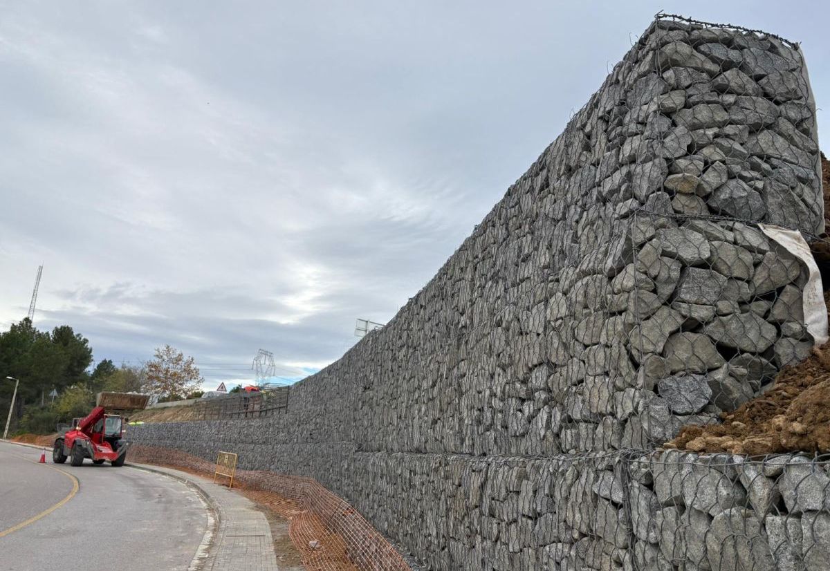 La solución adoptada para la contención de tierras en el costado de la rotonda de Castellnou es un muro de suelo reforzado con el sistema Terramesh, con alturas de hasta 5 metros. Este sistema modular, con paramento vertical y acabado en gavión, está formado por módulos de malla de alambre hexagonal de doble trenzado 8x10D2.7/3.2 y recubrimiento polimérico. En esta aplicación, la malla de doble trenzado actúa como refuerzo secundario, mientras que el refuerzo principal se logra con geomallas tipo ParaGrid.