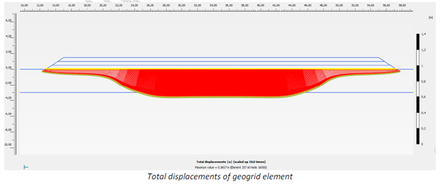 The plane strain model means the strains can only take place in the xy plane. Along the longitudinal axis (out of plane direction) the strain is assumed to be zero, εz = 0. Consequently, the length of the MSE wall must be significantly larger than its width.