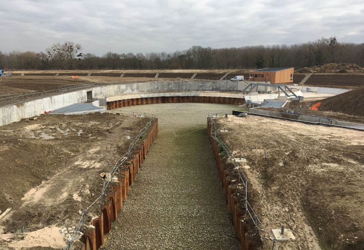 Si le parcours de canoë-kayak slalom est complètement artificialisé en béton, les canaux d’amenée reliant la raquette d’arrivée au lac sont fondés directement sur le sol en place. Les flancs des canaux sont stabilisés par des palplanches, et pour éviter l’érosion et l’enfoncement du fond du canal, une protection en Matelas Reno d’épaisseur 30cm a été mise en place par les équipes de Maccaferri. Cette technique présente la particularité d’allier robustesse, durabilité et souplesse, s’adaptant particulièrement à des contraintes en milieu hydraulique. Une attention particulière a été portée pour bien protéger l’espace entre le creux des palplanches et les Matelas Reno ; le géotextile présent en sous face des matelas a été prolongé dans cette zone et a été remonté le long de la palplanche, puis un comblement en pierre à gabions a été réalisé pour s’assurer qu’aucune zone ne soit laissée exposée à l’érosion. Les spectateurs des épreuves de canoë–kayak auront l’occasion de s’assoir sur les gradins naturels végétalisés réalisés avec des modules de sol renforcé Terramesh Vert. Ils ont été spécialement adaptées à la géométrie des gradins ont été fabriqués, ayant une hauteur de 45cm, une inclinaison de 13° par rapport à la verticale et une longueur de 3m.