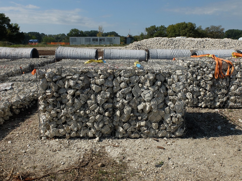 La préfabrication des structures a été réalisée par les équipes de Maccaferri sur une aire de stockage à proximité du chantier et la pose a été réalisée par les équipes de Maia Fondations depuis une barge sur le Rhône.