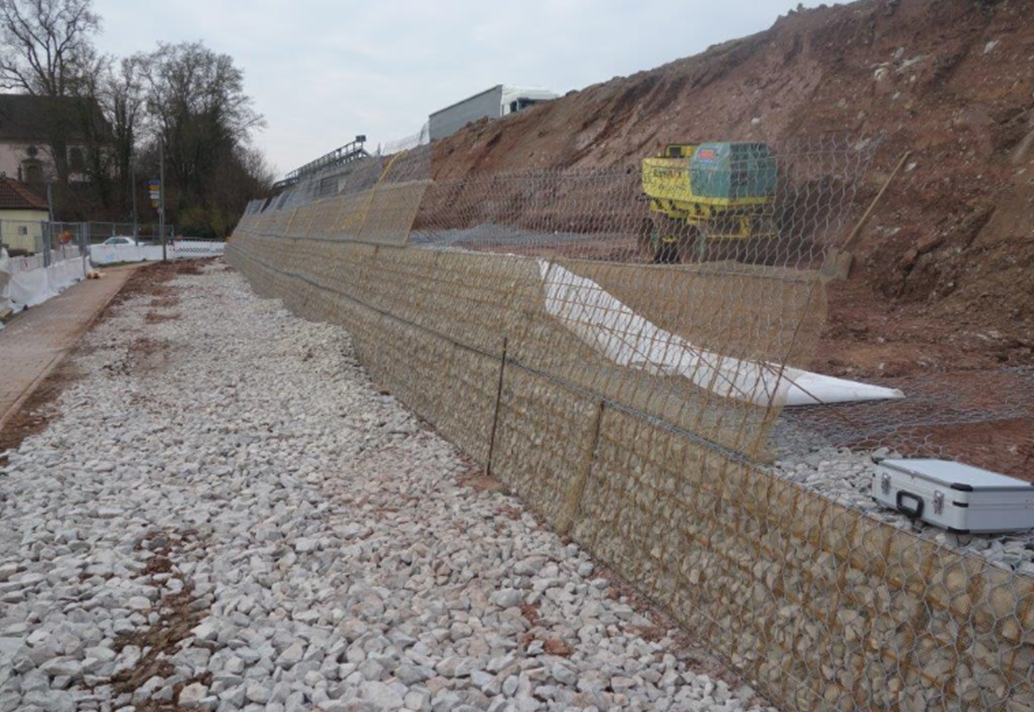 Maccaferri through his local partner BECO Bermüller proposed a reinforced soil structure made by modular elements of Green Terramesh 70°. The typical section was 7 steps of 0,76m, at a total height of 5,32m. One of the reasons for the choice was the possibility to cover the visible surfaces with green natural vegetation, in order to integrate well the structures in the landscape, but during the construction, the soil appeared to be too sandy and of bad quality. The contractor then decided to fill the front with stones in order not to have erosion problems due to rainwater flow.