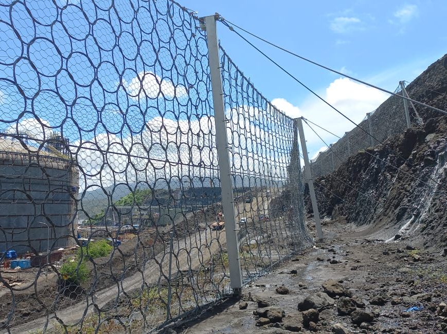 A real example from our portfolio is the Rockfall Barrier System installed for Amman Mineral, West Nusa Tenggara, designed to withstand forecasted rockfall energy on a key regional corridor.