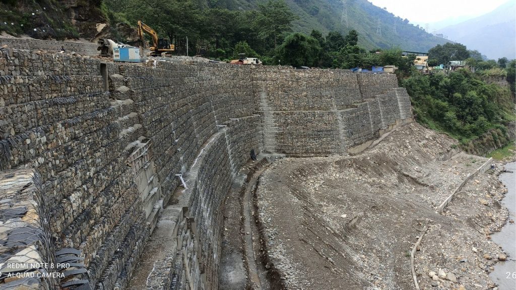 Following a detailed technical assessment, a shored reinforced soil wall system was designed and implemented to provide stable valley-side retention. The solution comprised a flexible gabion-faced reinforced soil structure using Terramesh® units, in combination with high-strength monoaxial geogrids Paragrid HF and ParaLink®, enabling the construction of reinforced soil walls with heights ranging from 8.8 m to 26.4 m. Due to limited right of way, Self-Drilling Anchors (SDAs) in combination with ParaLink® geogrids were incorporated to achieve structural stability despite restricted reinforcement lengths, highly variable subsoil conditions, and the proximity of a fast-flowing river. This hybrid system facilitated efficient load transfer and uniform pressure distribution at the foundation level while accommodating the challenging ground conditions.