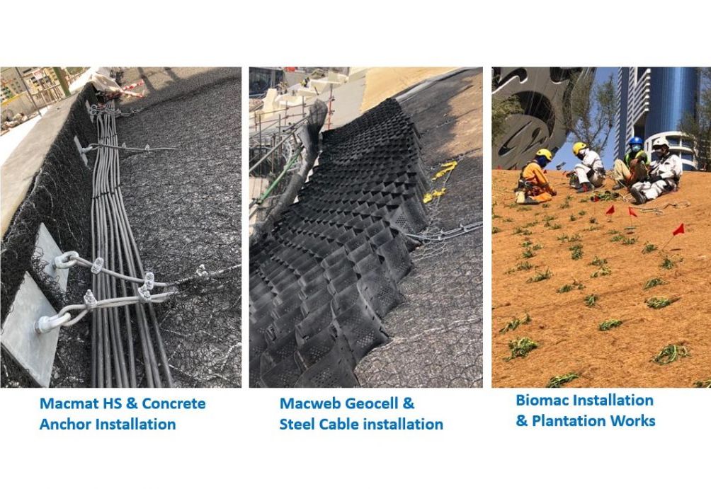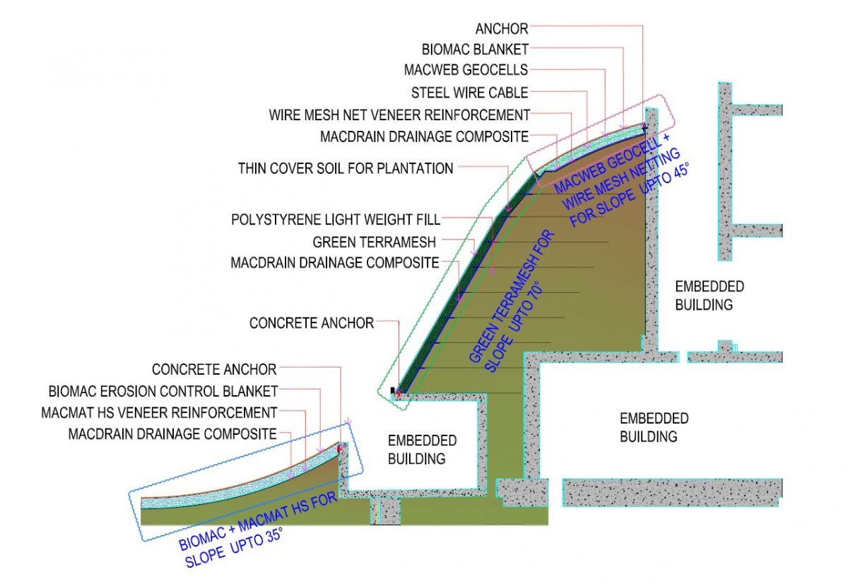 Maccaferri Middle East was chosen as the technology provider for the GREEN COVER SYSTEM; thanks to the wide range of products in our portfolio that can achieve the varying slope requirements of the artificial green mount in the project. After studying the landscaping requirements, Maccaferri proposed to categorize the green cover system based on final slopes, and accordingly, the products were suitably chosen as (1) Biomac cover for slopes up to 35-degree inclination, (2) Macweb geocell for slopes up to 45-degree inclination and (3) Green Terramesh reinforced soil system for slopes up to 70-degree inclination. For the first two cases, continuous veneer reinforcement was proposed below the thin soil fill by means of Maccaferri wire netting or Macmat HS, which will be anchored on the concrete beams at the top. Additionally, Macdrain drainage composite was proposed below the entire surface area of the green cover system for the easy draining of continuous irrigation water expected in the future. Maccaferri Middle East was involved in the design, supply, and construction assistance of the project.