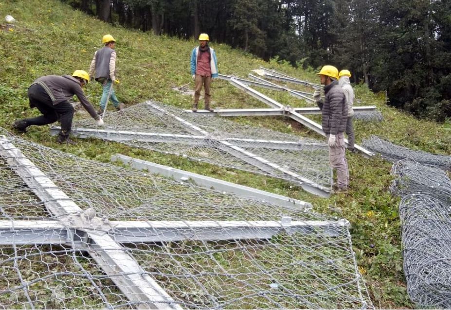 Based on the prevailing difficult site conditions and short construction window available, flexible snow barriers comprising of snow umbrella (Snow ErdoX) units are selected for MSP 11. Snow ErdoX units are advanced avalanche protection system, which are self stable and has metallic structure with pyramid shape, lesser weight, easy to transport and quick to install. As the snow accumulates on the slope, these innovative control measures retain the accumulated snow pack, thus preventing the initiation of an avalanche. Based on functional design, 10 lines of Snow ErdoX barriers (120 no.s (external reinforced units and internal unreinforced units) are constructed to constitute a total stretch length of 469m. The design of Snow ErdoX is based on Swiss technical guideline(2007). The lines are spanning above and below the highway based on the min. spacing calculated and overall identified formation area with individual Snow ErdoX units installed at distance of a 50 cm from each other(to allow the passage between the structures, which is prevented by traditional barriers). The end units on each of the barrier lines shall be of reinforced type. The foundation system of Snow ErdoX units are of anchors -SDA-32mm and pull out tests are performed to verify the bond strength considerations.