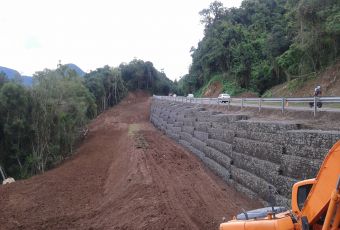 A solução encontrada foi a execução de um muro em solo reforçado com Terramesh® System. Quando atingido o fundo da escavação, iniciou-se a construção do muro de contenção, que contemplou uma sequência de aterro compactado concomitante com a execução do sistema Terramesh® System. As vantagens apontadas nesta obra foram de baixíssimo risco operacional da obra; velocidade de execução proporcional à frente de trabalho (quanto maior a frente, maior a velocidade); não necessitou caminho de serviço; execução menos sensível às condições climáticas.