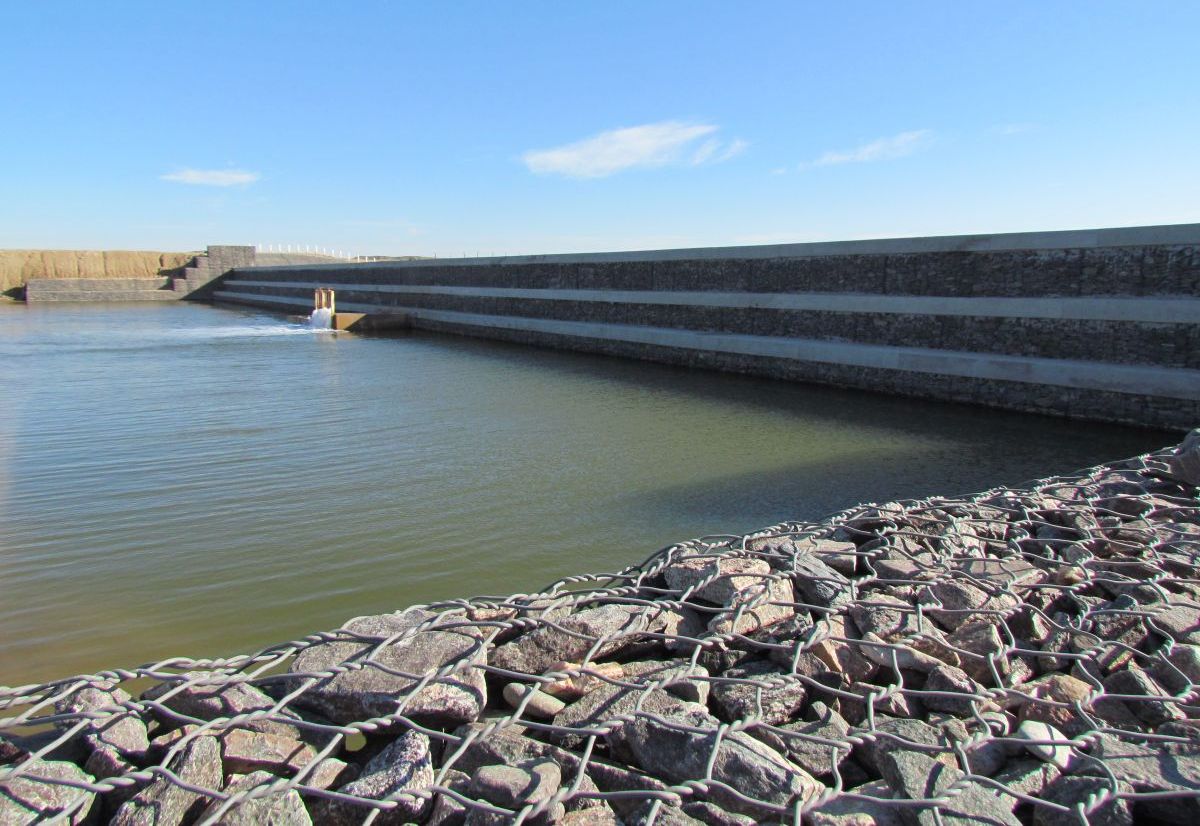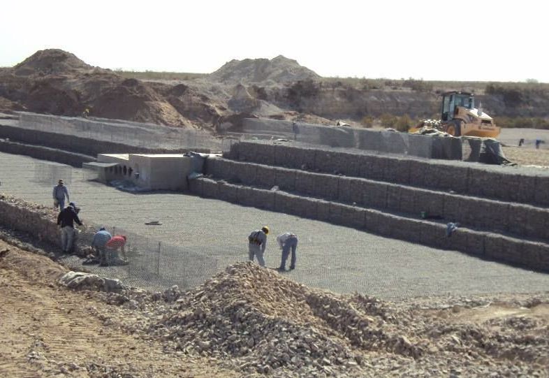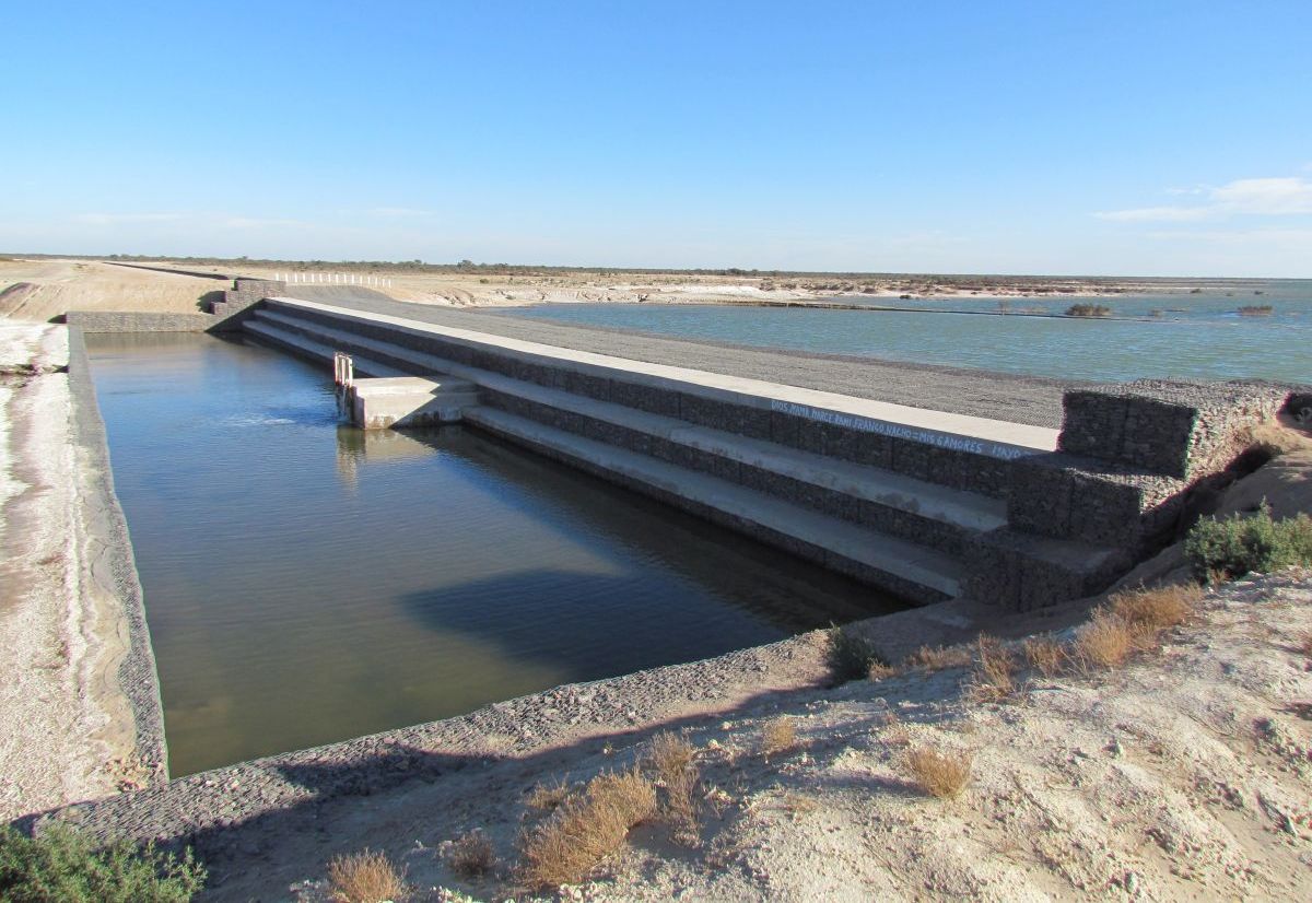 A la fecha se han construidos dos de los seis azudes proyectados. Para la construcción de la cortina, obras de aproximación y el cuenco de disipación se emplearon gaviones caja y colchones reno fabricadas con alambre revestido con PVC (única protección eficaz contra la alta salinidad del agua y los suelos presentes en el lugar). Los dos azudes que fueron construidos tienen las siguientes caracterÃsticas: vertederos con ancho aproximado de 60m y 70m, y altura de 4m y 3m respectivamente.