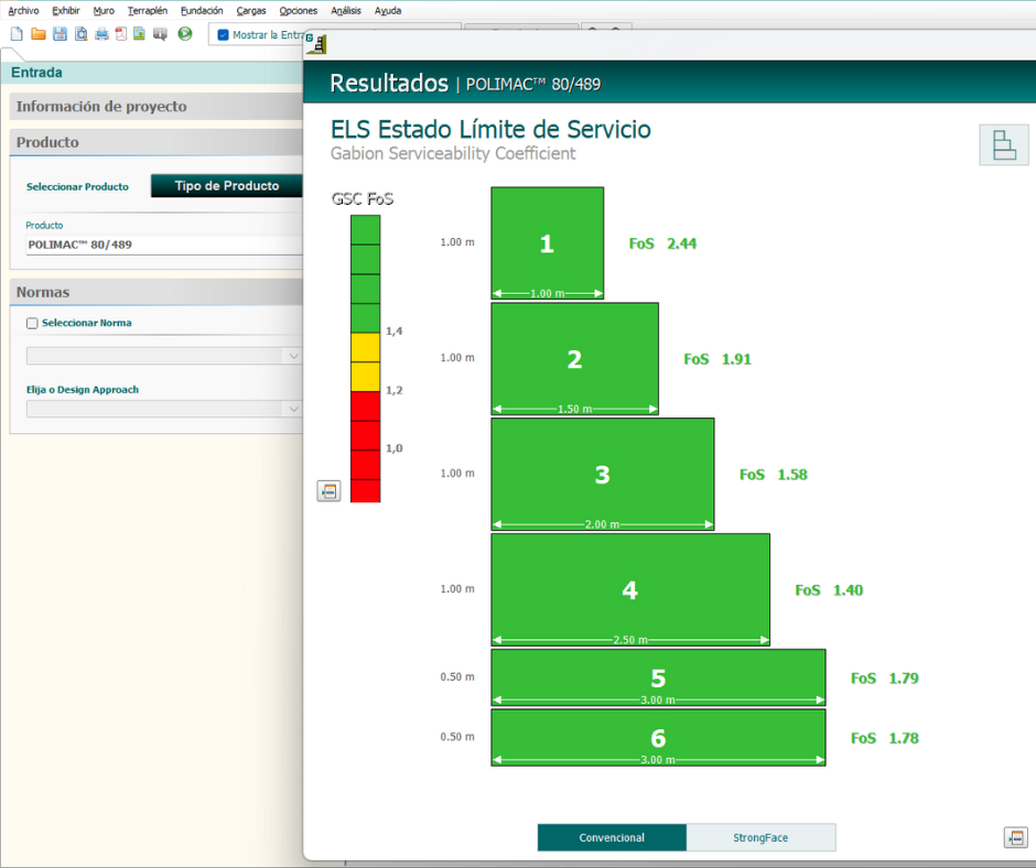 El principal objetivo de este programa para muros de contención es facilitar el análisis técnico de estas soluciones, así como garantizar la seguridad y el rendimiento de la estructura de gaviones a lo largo del tiempo. Para ello, luego de ingresar los valores solicitados en cada paso del proceso, GAWAC 3.0 arroja estos dos análisis: