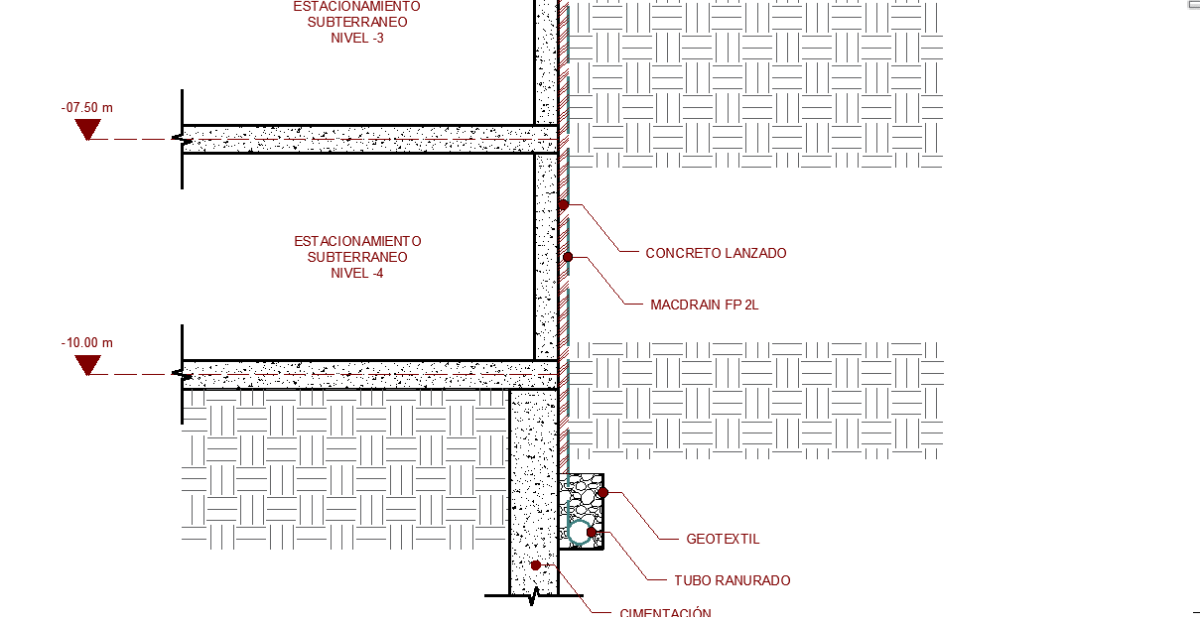 Se colocó un geodren MacDrain FP compuesto por un geotextil que permite el paso del agua, pero retiene las partÃculas más pequeñas de suelo, un núcleo drenante que permite redirigir el agua un sistema de drenaje a través de sus vacÃos y una pelÃcula semi-impermeable que protege de la humedad la estructura de concreto. Se optó por este material por su rápida y fácil instalación, por sus dimensiones ya que al ser un geocompuesto muy delgado no modifica los parámetros del proyecto y al ser ligero y flexible se puede adaptar a cualquier superficie.