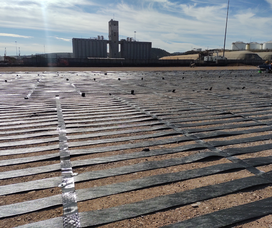 Un excelente ejemplo del uso de geosintéticos en suelos cohesivos es el proyecto del patio de almacenamiento del Puerto de Guaymas. Aquí, el terreno estaba integrado por arenas limosas con grava, pero también por una capa de 10 m de arcillas muy blandas. En tal caso, la solución fue implementar geomallas uniaxiales para el refuerzo basal.