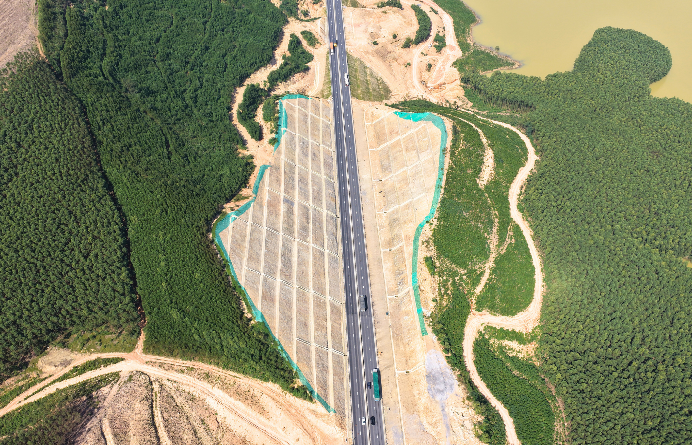 Constructing this route presented significant geotechnical challenges. The alignment traverses soft soils, high embankments, and multiple cut slopes requiring reliable stabilization. In addition, central Vietnam’s intense rainfall and flood-prone conditions demand robust drainage and erosion control solutions.
