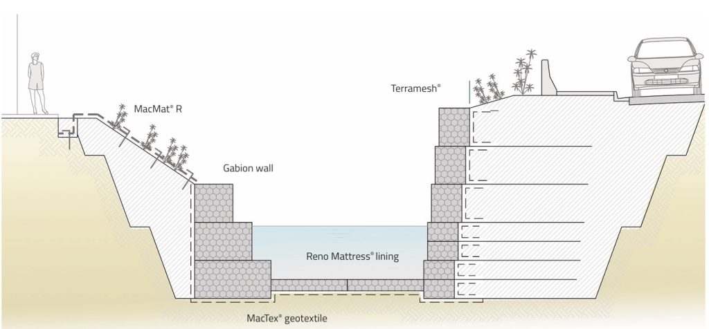 - MacTex® geotextile filters to prevent soil migration beneath protective layers