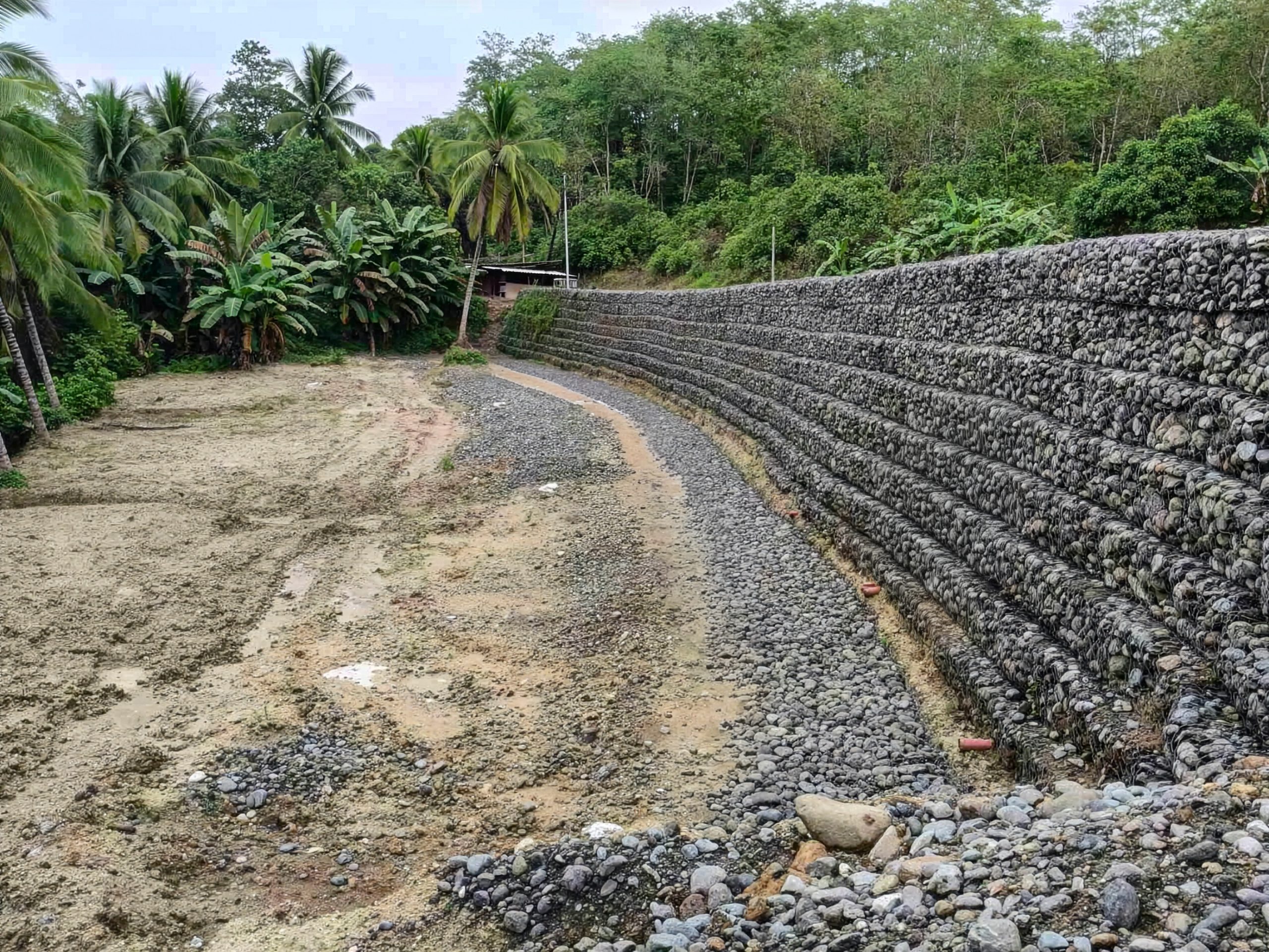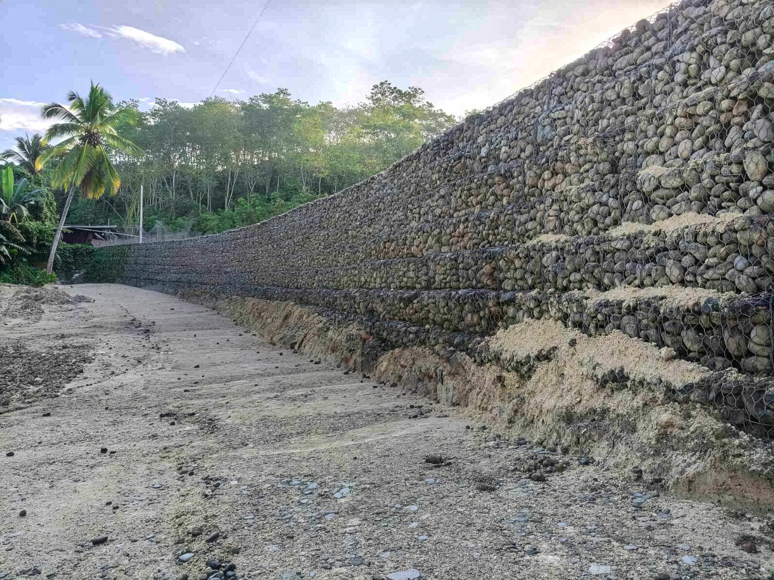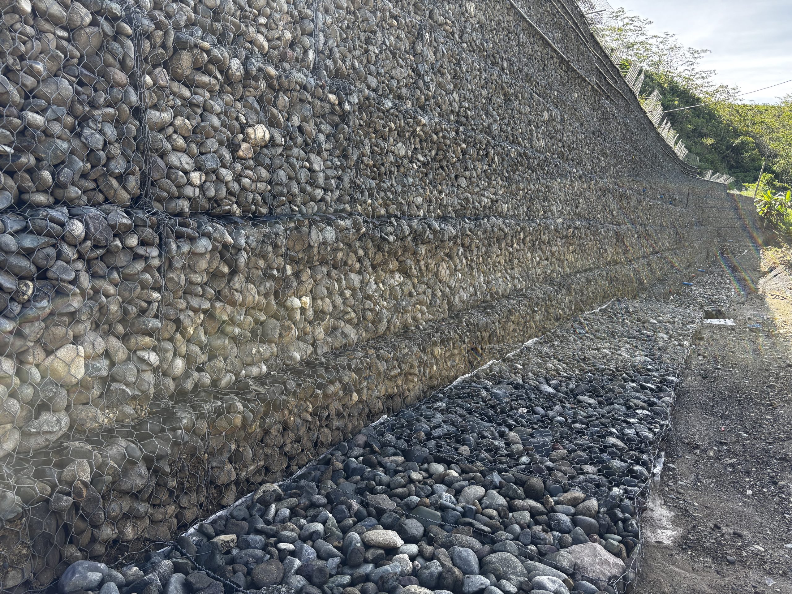 Maccaferri Philippines implemented a Mechanically Stabilized Earth (MSE) wall system to reinforce the slope and protect the road. Using the Terramesh® system, combined with geogrids for soil reinforcement, MacDrain® for effective water management, and MacTex® for filtration and separation, the solution provided a well-integrated structure designed to withstand heavy rainfall and prevent further erosion. This engineered approach ensured both structural stability and efficient drainage, addressing the root causes of slope instability.