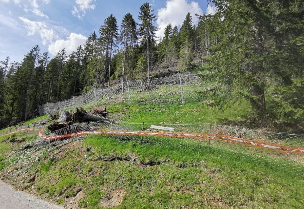 The flooding events of late October 2018, coupled with a very serious windstorm episode, have produced in the regional mountain territory and in particular in the Belluno area of the Alto Agordino, the destruction of large areas of forests.A significant part of these woods, performed important protective functions in relation to the danger of avalanche fall in favor of inhabited areas, individual dwellings and related roadways of access. The need to remove the woody mass on the ground highlighted the need to carry out works that would ensure the stability of the snowpack, leading to a prevention of avalanche risk. The avalanche area under exam, located above the municipal road to Palla – Agai in the municipality of Livinallongo del Col di Lana, is an open slope with southern exposure and an average inclination of 35.5°; the area is about 7.5 ha, from elevation 1450 m asl to elevation 1650 m asl, for a maximum length of about 280 m and width of 420 m.From the surveys carried out, there was the concrete possibility of rock falls that may detach from the overlying rock walls. This issue is evident also in the meadows below the road, where accumulations even of recent formation can be observed.The conditions described above, have been greatly aggravated following the flood of October 2018, which led to the reshaping of the debris and eluvial cover due to the crashing of countless trees.