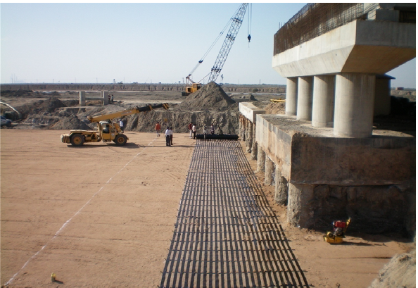 The stone column technique, also known as vibro-replacement or vibro-displacement, is a ground improvement process where vertical columns of compacted aggregate are formed through the soils to be improved. Primary purpose of soil improvement by stone column technique is to increase the bearing capacity of foundation soil and reduce post construction settlement. Stone column derives its support from lateral resistance provided by the surrounding soil, which is caused by: • bulging of the uncemented stone column under the load. • resistance due to surcharge effect. • bearing support offered by intervening soil. The geosynthetic raft is ParaLink®, which is a monoaxial array of geosynthetic strips having unidirectional strength ranging from 100 to 1350 KN/m. The purpose of providing ParaLink® as basal reinforcement is to ensure proper distribution of the load from the superstructure to the stone columns and reduce differential settlements. Ground Improvement details: The area is recommended to be excavated till the founding level where the stone columns are installed. Stone columns: • South side – entire zone including the reinforced and unreinforced section was improved by stone column technique. • North side – owing to relatively better quality of soil, stone columns were provided only under reinforced soil. ParaLink® was laid throughout the entire zone.