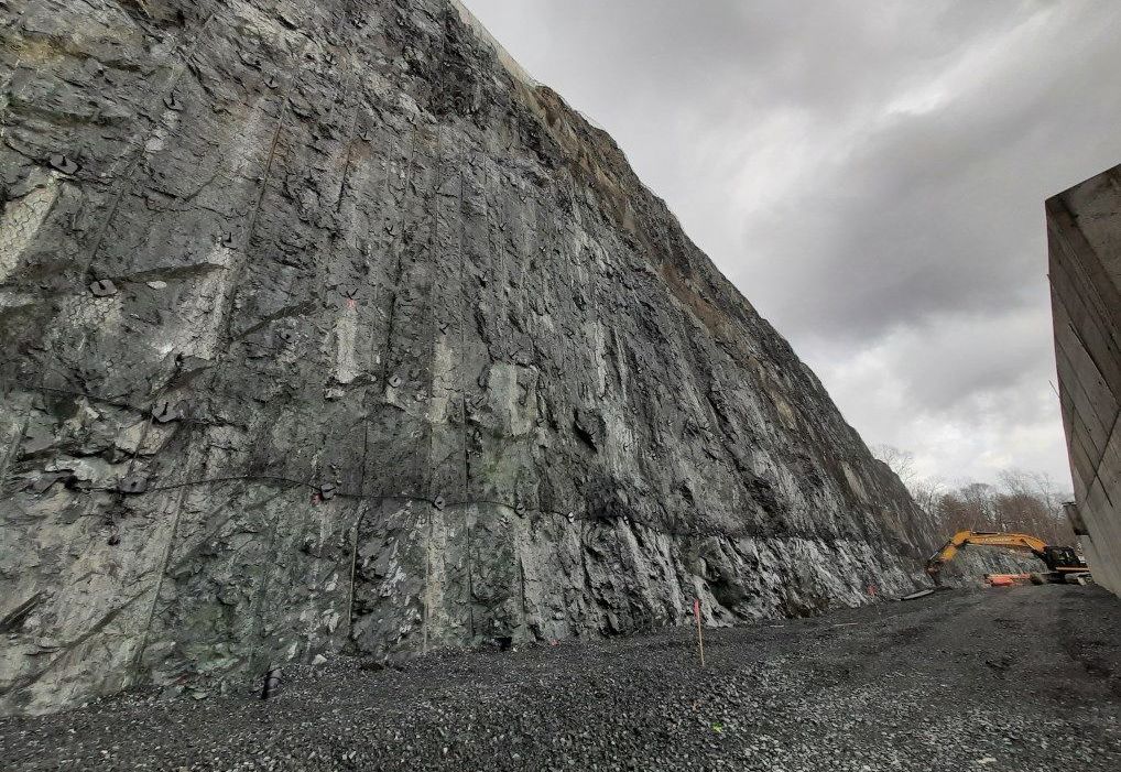 Based on the rock wall’s height, geotechnical characteristics and the proximity of it to the school, a pinned drapery solution was the recommended method to address the hazard. The design accounted for more than 100,000 sq. ft. of Maccaferri’s high strength composite mesh: SteelGrid HR30P used in combination with around 2000 anchors. The SteelGrid HR30P product consists of a high strength PVC coated composite cable mesh with high tensile cables longitudinally interwoven into a double twisted steel wire mesh every 30 cm. These cables are inserted into the mesh during fabrication, reducing manufacturing costs and improve the performance of the mesh. The interwoven cables provides the mesh with extra strength and better distribution of load from the anchors points. The PVC coating provides the mesh with the ability to blend with the rock underneath creating a aesthetic pleasing solution. For this particular project, a black color for of the coating was the architect’s choice to blend the solution with the igneous rock background. Maccaferri worked closely with Maine Drilling & Blasting to increase the efficiency on the installation of the proposed solution. This project was conducted in many phases and ended on fall of 2022,and both the client and architect are pleased with the result. The black coloring of the mesh blends it perfectly with the background reducing its visual impact.