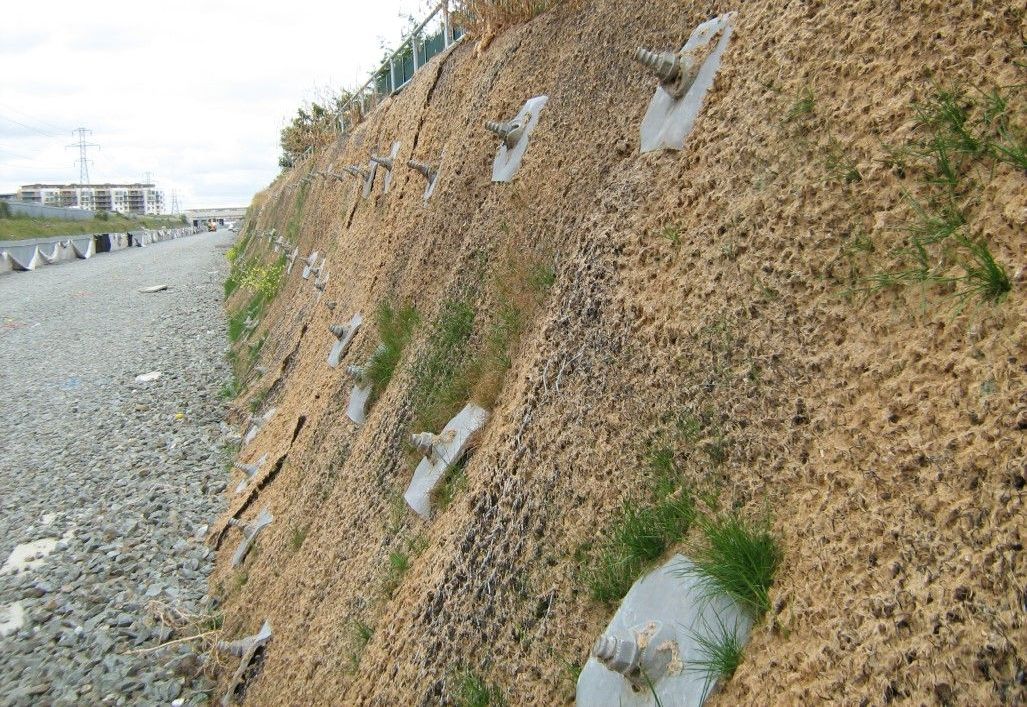 MacMat® R and soil nails, in conjunction with decent topsoil, create a vegetated face finish. In this project, the MacMat® R face was hydro seeded to accelerate the establishment of vegetation. Successful vegetation relies upon intimate contact between the MacMat® R and the topsoil beneath.