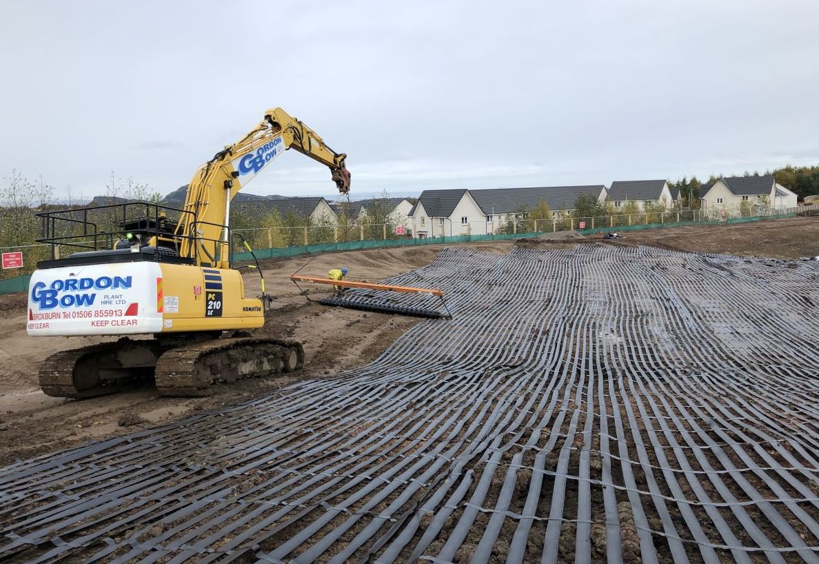 The proposed site topography was complex as it included a number of mounds, slopes and a SuDS pond along with a meandering footpath network to connect with neighbouring districts. To fully understand and analyse the requirements Maccaferri built a 3D model of the site. This digital modelling approach enabled the identification of two discrete areas on the site, and optimise the design by using different strengths of geogrid appropriate to the local conditions in each area.