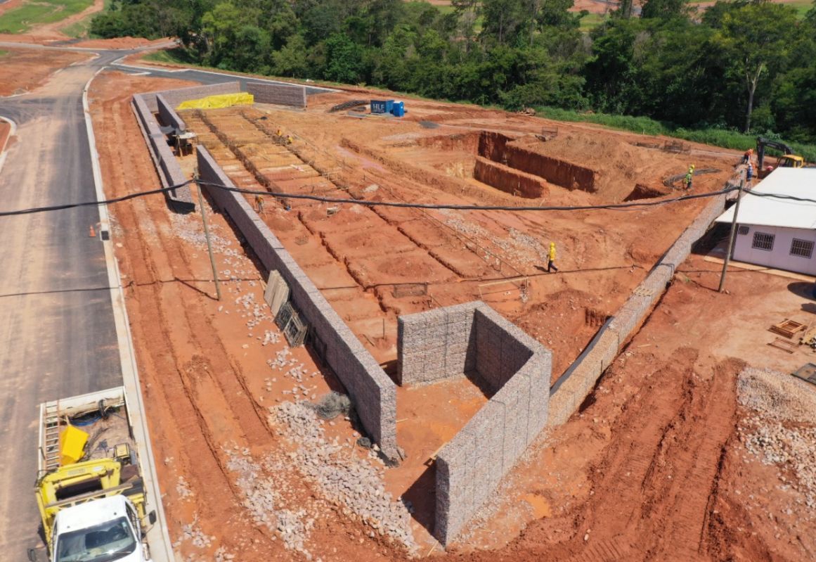 The retaining walls were designed using a gravity gabion retaining system. The architectural boundary walls were defined with a maximum thickness of 50 cm. To stabilise the architectural walls with gabions, it was necessary to use an internal metal structure that guarantees their stability, while the hexagonal mesh gabions enclose the filling material and provide the finish idealised by the architect. In all, the architectural walls will have a face area of more than 500,00 m².