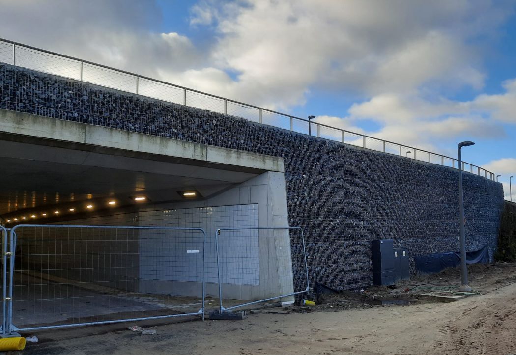 The Oosterweel Link project is a new 15km-long motorway connection developed by Lantis for completing the Antwerp ring road R1 (Belgium). It is a major project in Belgium and its design started in the 1990s to find a solution to the congestion problems in and around Antwerp. The total estimated cost of the project is approximately €4.5bn. The Antwerp ring road is a key part of the Trans-European Transport (TEN-T) Core Network. Maccaferri collaborated with the design and building of the Mechanically Stabilized Earth (MSE) walls with its main product family „Terramesh“. This is a well-known system used in Europe and in the rest of the world to support or enable the construction of infrastructures in tight urban corridors, forming retaining walls, road embankments, wing walls and bridge abutments known as Geosynthetic Reinforced Soil-Integrated Bridge Systems (GRS-IBS). „Terramesh“ double twist steel wire mesh reinforcements have been used in combination with ParaLink® and Paragrid® geogrids representing an evolution and a significant advantage for both cost-effectiveness and performance. The project includes 15.000 facing sqm of „Terramesh Green®“, 14.000 facing sqm of „Terramesh Mineral® and System® and 5.000 facing sqm of gabion cladding. During 2020, 6.000 sqm of MSE walls have been already installed with a maximum height of 6.5m for the structures erected so far. The Terramesh products can be either with a stone mineral facing or a green facing, according to the architectural plan: in Oosterweel for architectural reasons, most of the structures present a stone facia.