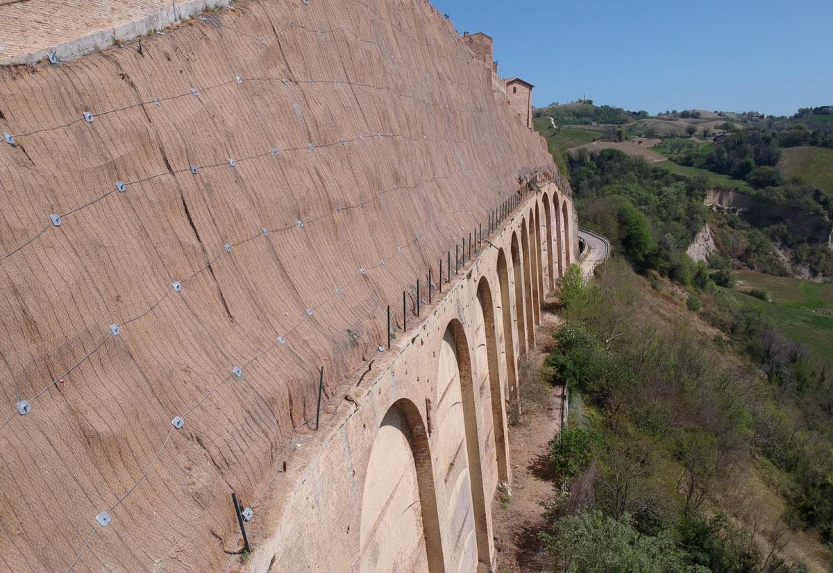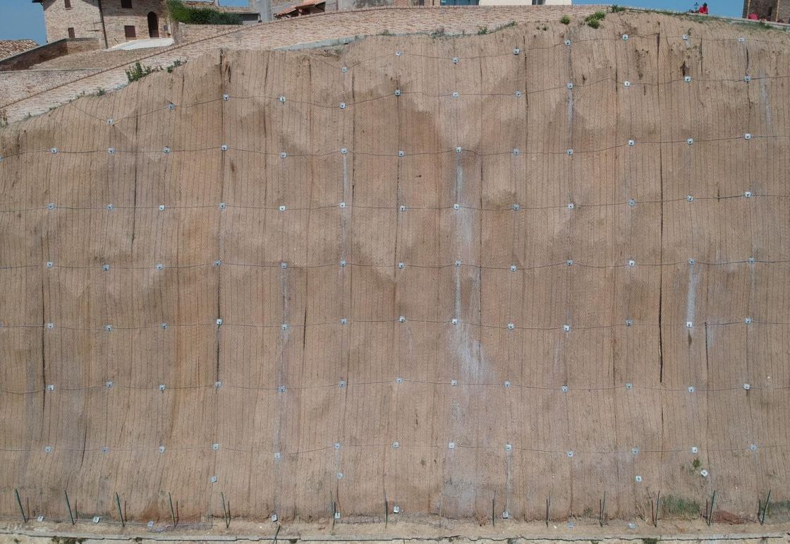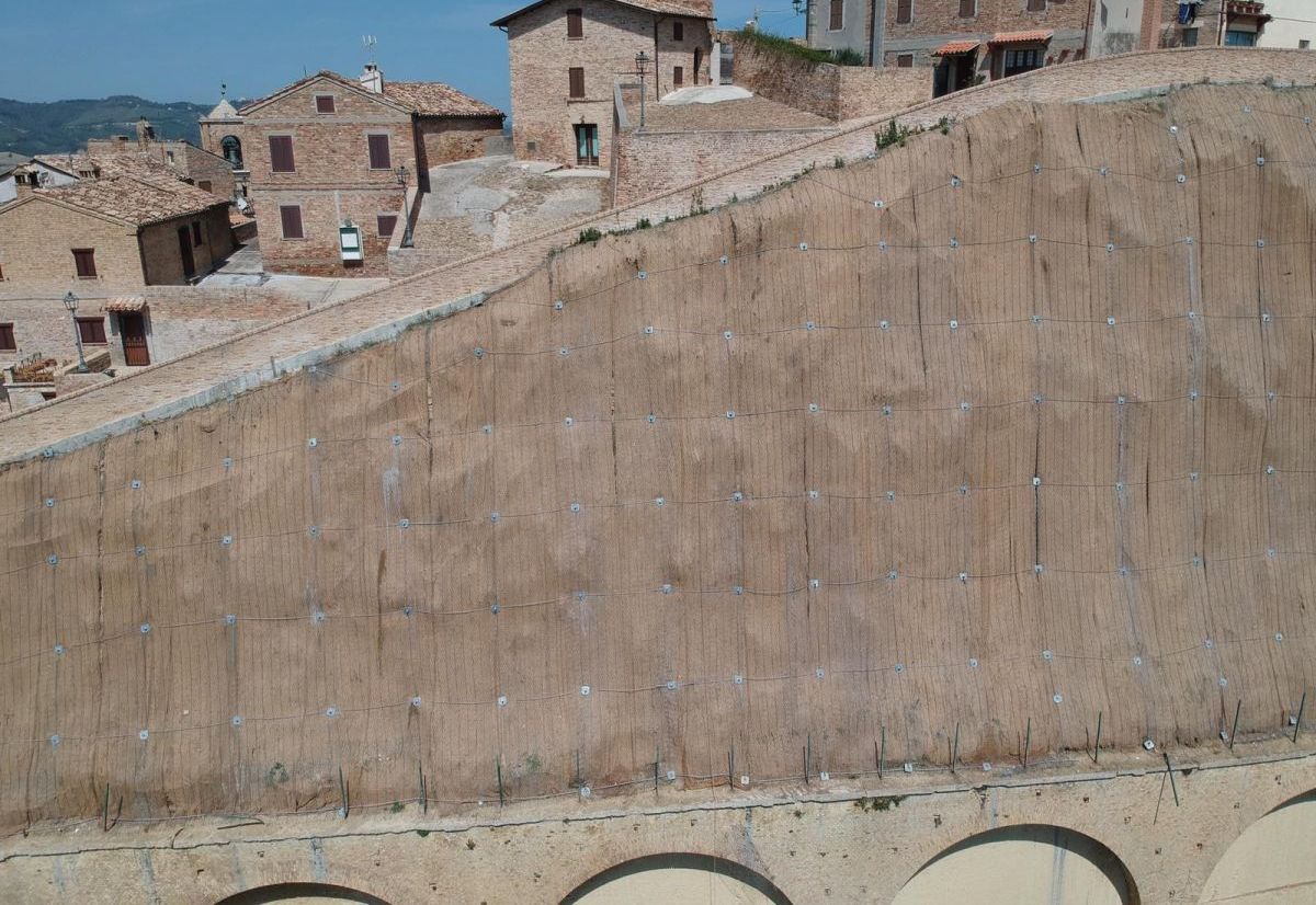 In order to protect the buildings of the historic center of Castignano and secure the road located below the cliff, a stabilization intervention was carried out on the upper portion of the sandy slope not supported by the existing wall. The works involved a surficial reinforcement system using Steelgrid HR30, anchored to the stable substrate with passive nails, together with the installation of a biomat to provide additional erosion protection.