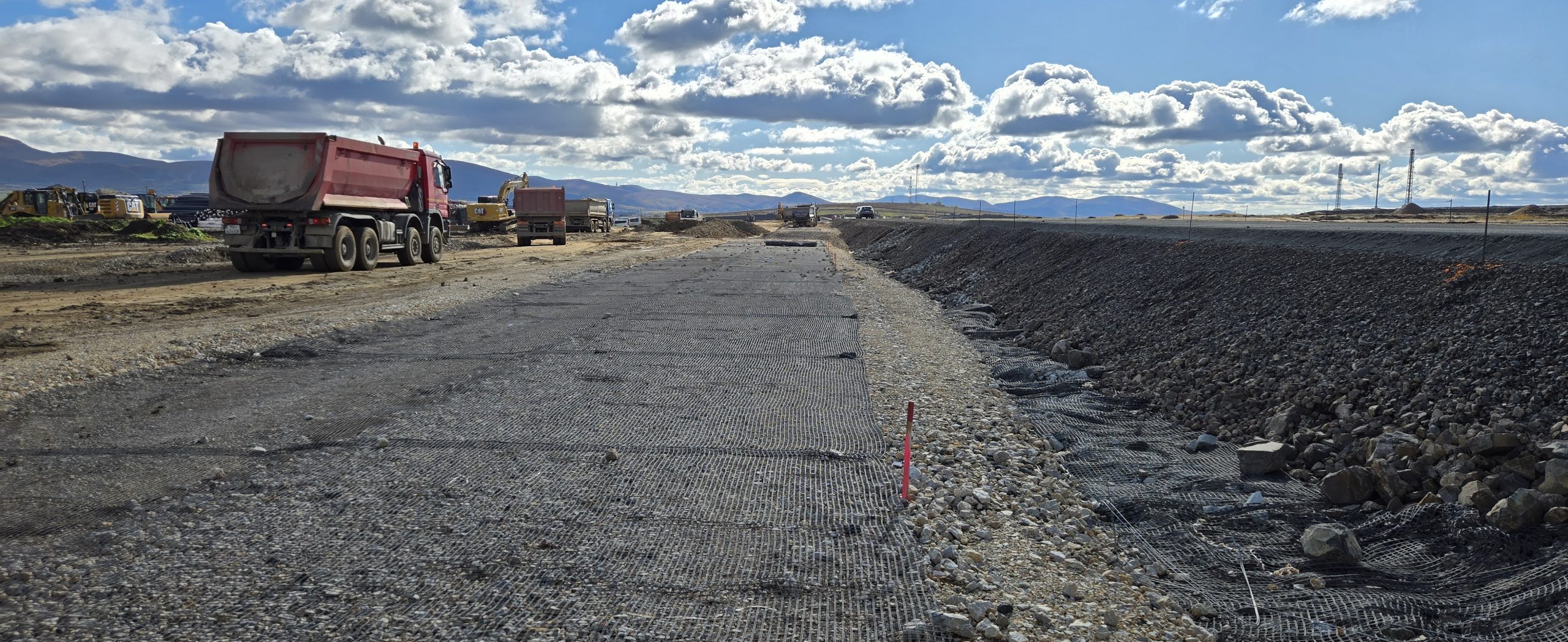 The side facing the roadway consists of a reinforced earth structure with a stone facing at a 70° slope—the Mineral Terramesh® system. This system was chosen as the most suitable solution due to its long service life and quick installation, as it is a prefabricated element.