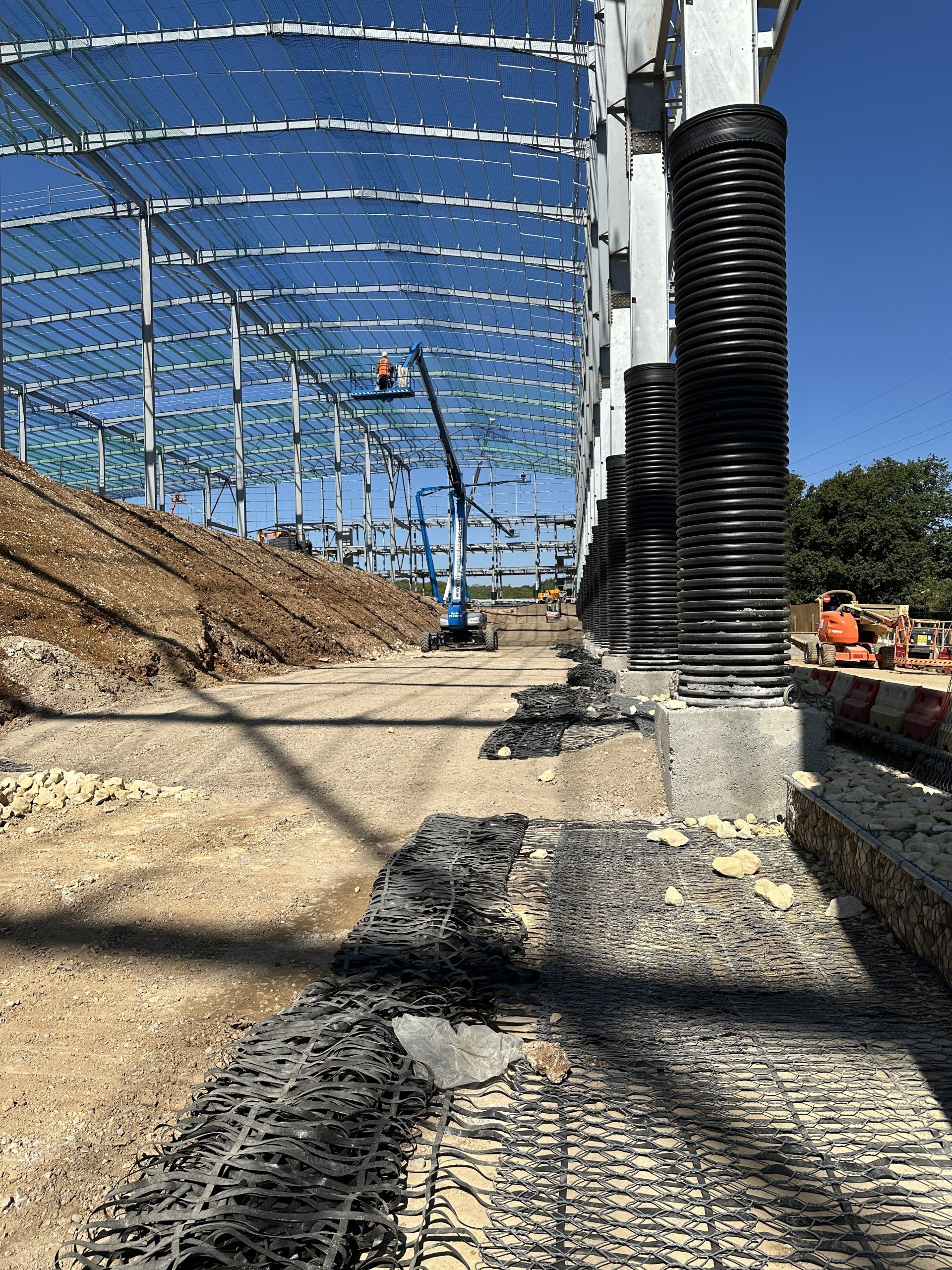 The construction of a large commercial warehouse near the M1 in Luton required the design and installation of a high retaining wall exceeding 7 metres. The retaining structure needed to align precisely with the building line, integrate with structural columns, and provide stable support for the warehouse slab under strict settlement tolerances.