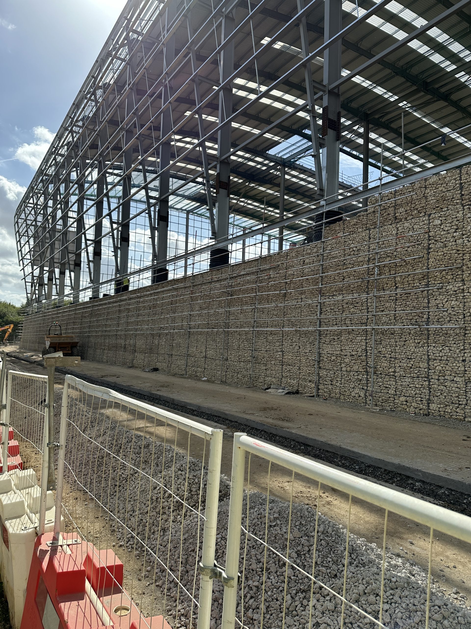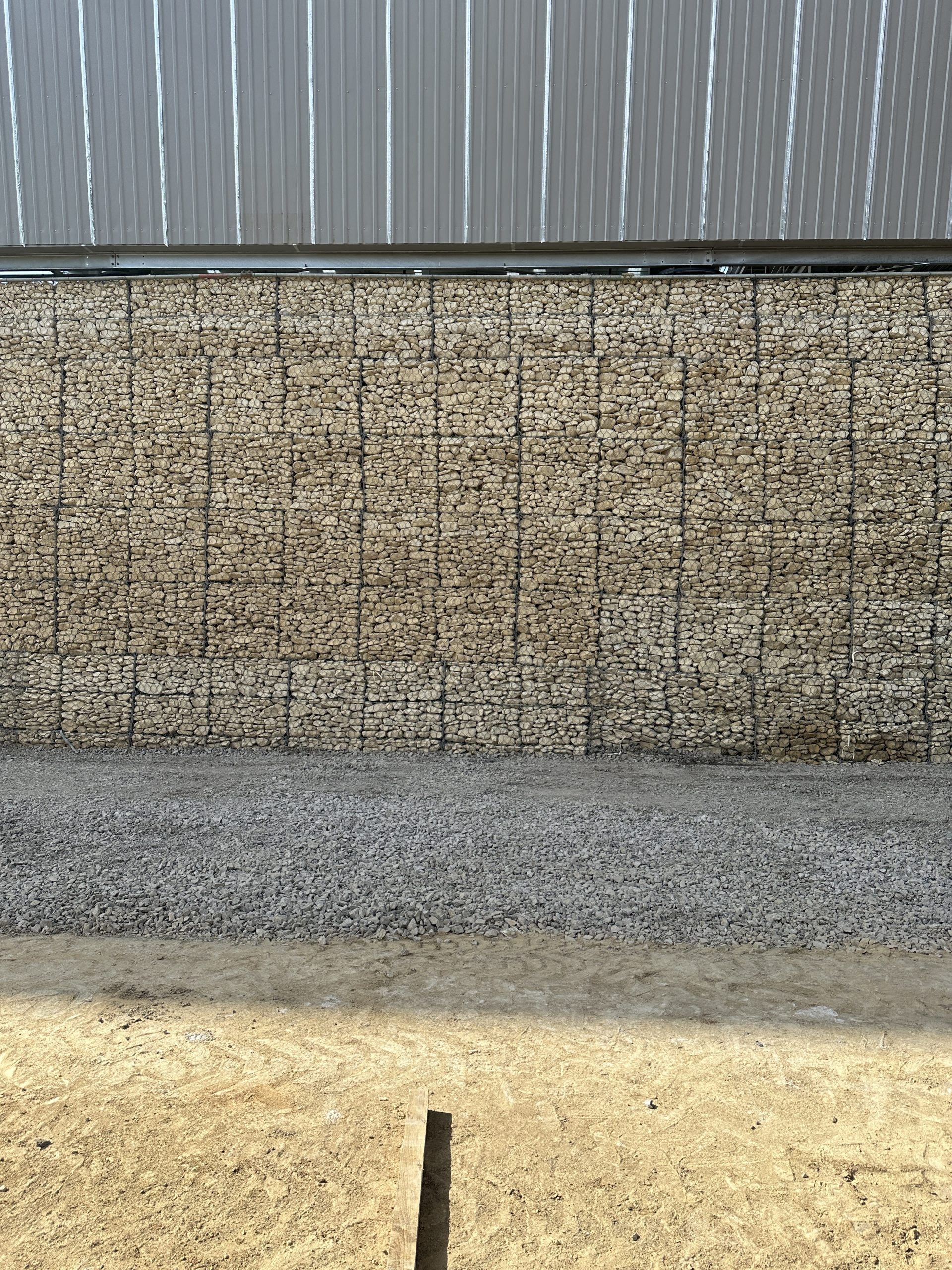 The Gabion Terramesh units, consisting of double-twisted wire mesh baskets filled with stone, allowed the retaining wall to be shaped around structural building columns with ease. This flexibility eliminated the limitations associated with rigid concrete panels and ensured seamless integration with the warehouse structure. The columns were sleeved to protect against potential movement and maintain structural integrity.