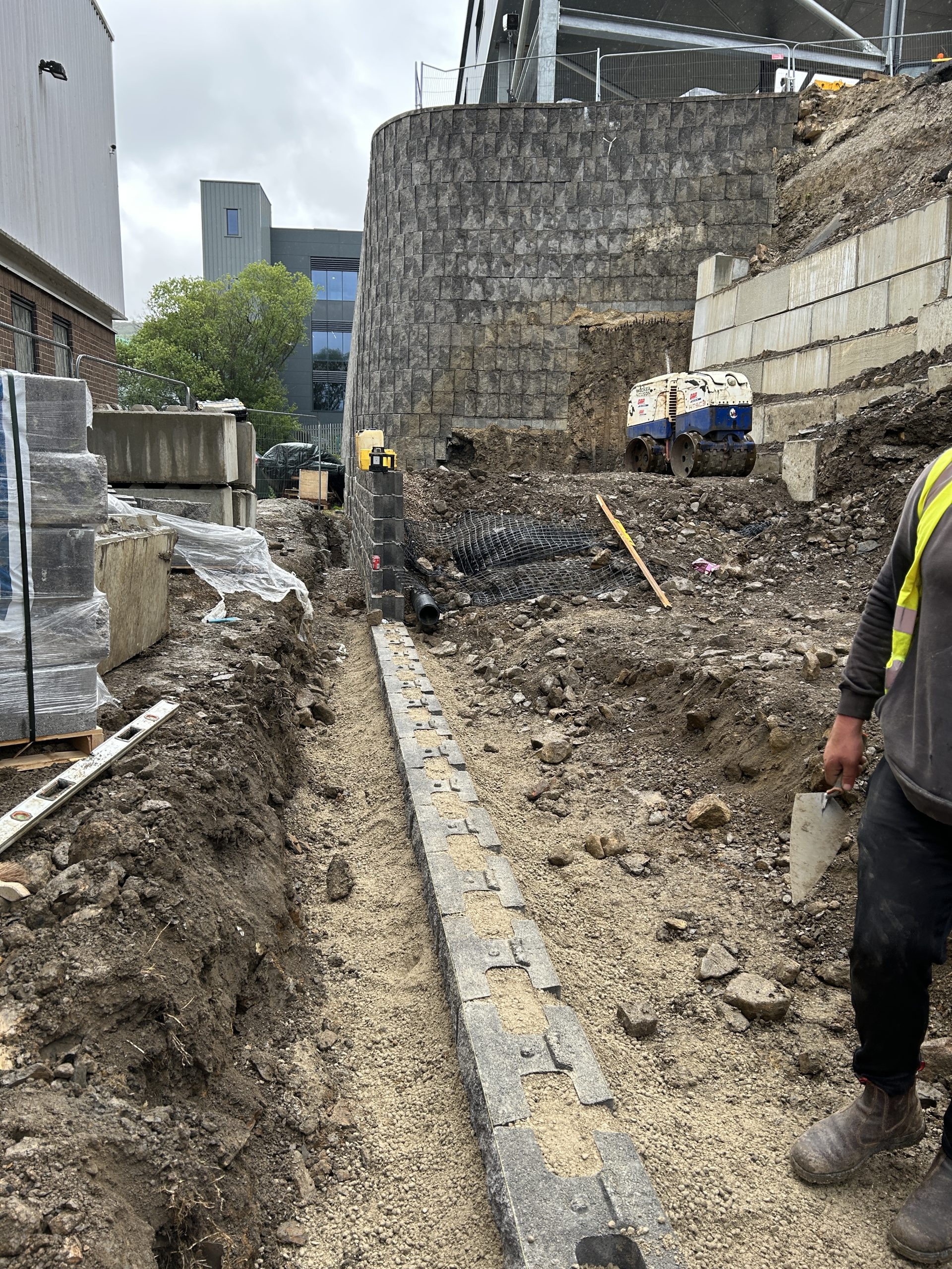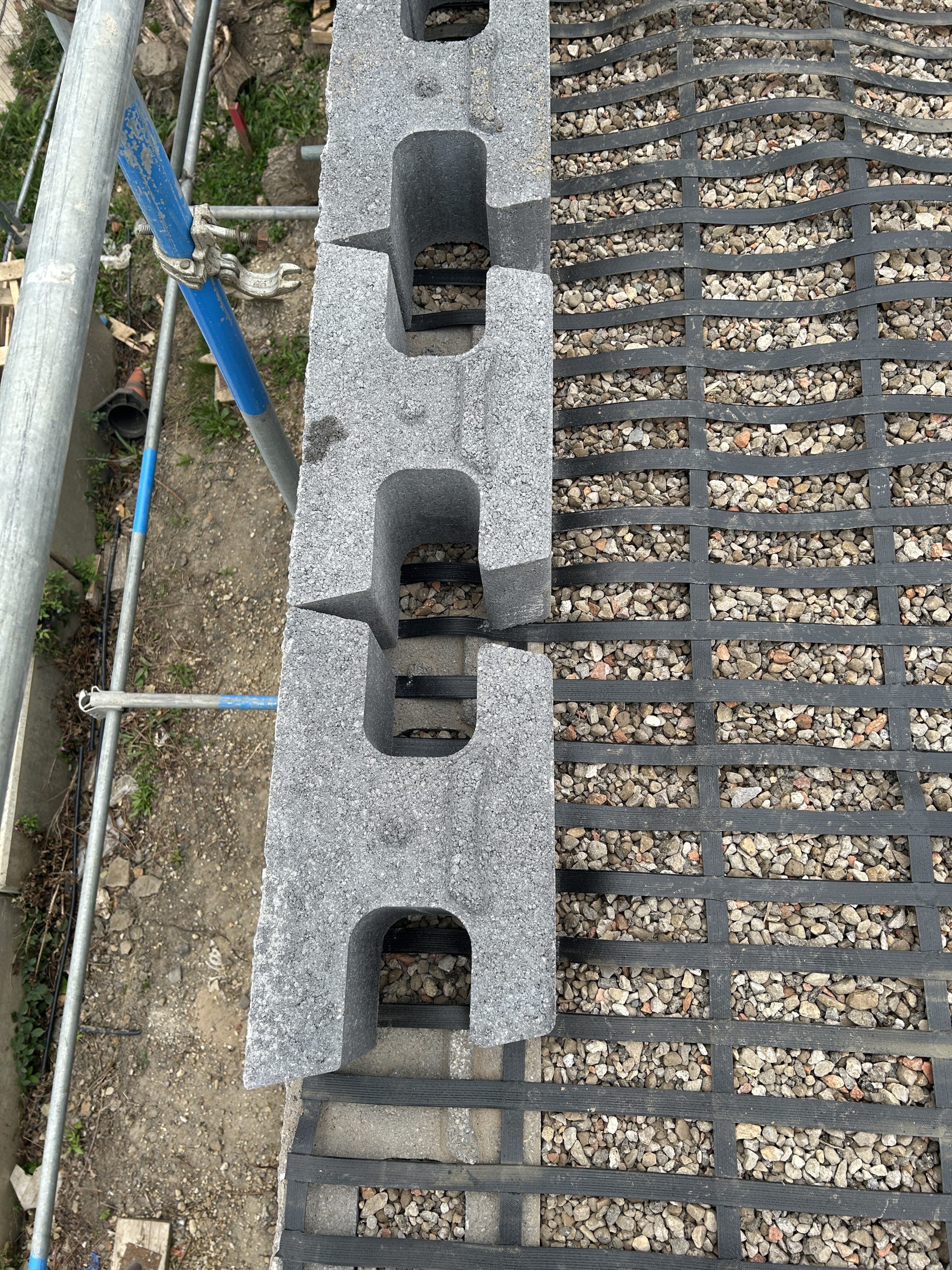 To address the site’s topographical constraints, Maccaferri proposed the use of its MacWall 4.0 segmental retaining wall system. This modular solution was selected for its proven performance, aesthetic flexibility, and ease of integration with existing structures. A 6-metre-high retaining wall was constructed along the length of the extended car park, effectively creating the required plateau while maximising usable space.
