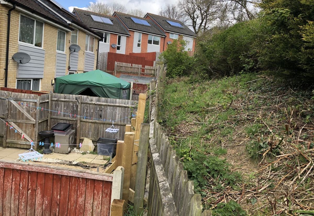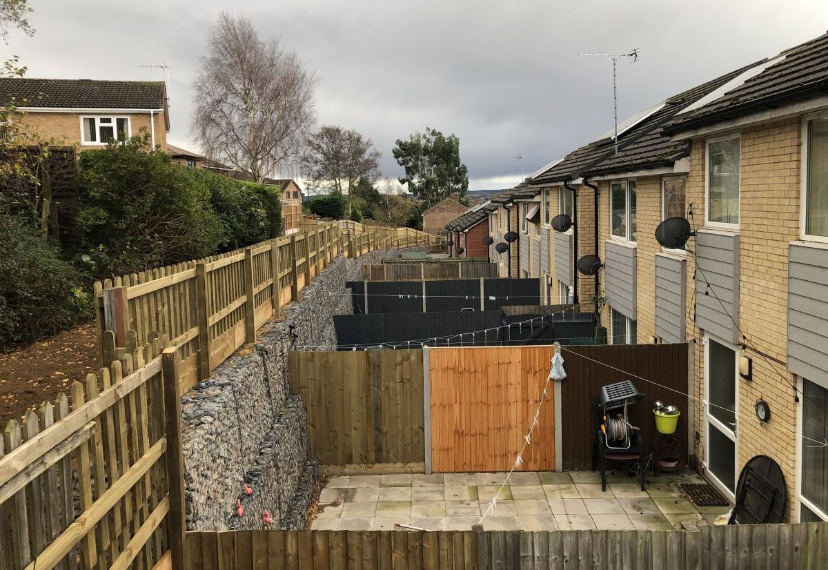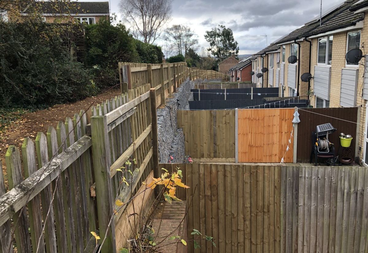 The project presented significant challenges due to restricted site access. The retaining walls were located within occupied residential back gardens, where space was extremely limited. This created difficulties for material delivery, plant access, and safe construction practices. Traditional retaining wall construction methods, particularly for gabion walls, typically require substantial temporary works and working space—both of which were not feasible in this environment.