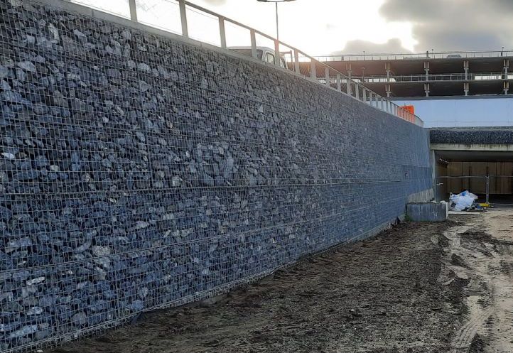 The Oosterweel Link project is a new 15km-long motorway connection developed by Lantis for completing the Antwerp ring road R1 (Belgium). It is a major project in Belgium and its design started in the 1990s to find a solution to the congestion problems in and around Antwerp. The total estimated cost of the project is approximately €4.5bn. The Antwerp ring road is a key part of the Trans-European Transport (TEN-T) Core Network. Maccaferri collaborated with the design and building of the Mechanically Stabilized Earth (MSE) walls with its main product family „Terramesh“. This is a well-known system used in Europe and in the rest of the world to support or enable the construction of infrastructures in tight urban corridors, forming retaining walls, road embankments, wing walls and bridge abutments known as Geosynthetic Reinforced Soil-Integrated Bridge Systems (GRS-IBS). „Terramesh“ double twist steel wire mesh reinforcements have been used in combination with ParaLink® and Paragrid® geogrids representing an evolution and a significant advantage for both cost-effectiveness and performance. The project includes 15.000 facing sqm of „Terramesh Green®“, 14.000 facing sqm of „Terramesh Mineral® and System® and 5.000 facing sqm of gabion cladding. During 2020, 6.000 sqm of MSE walls have been already installed with a maximum height of 6.5m for the structures erected so far. The Terramesh products can be either with a stone mineral facing or a green facing, according to the architectural plan: in Oosterweel for architectural reasons, most of the structures present a stone facia.