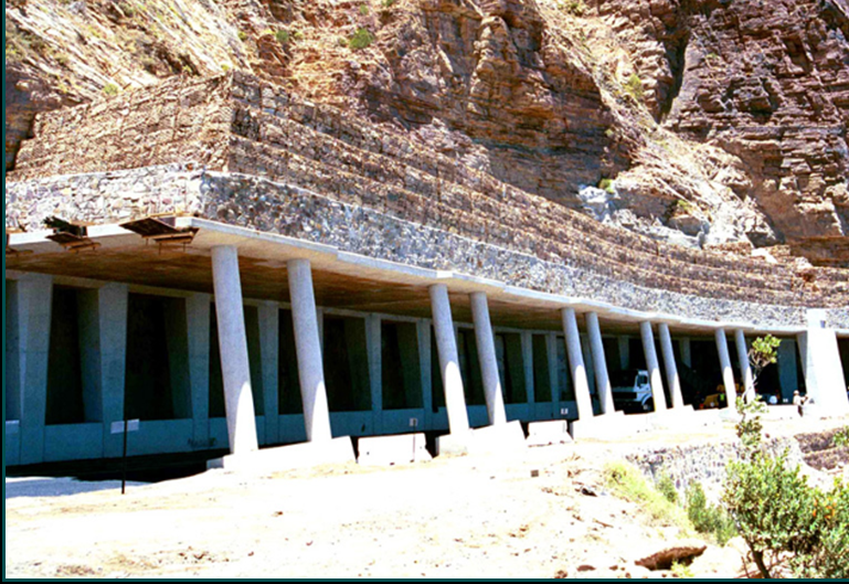 The reconstruction of Chapman’s Peak Drive required two reinforced concrete canopies built adjacent to the half-tunnel, to protect motorists using this scenic route from the impacts of any falling rocks cascading down near vertical cliffs 400m high and with energies of 7000kJ. These canopies, one a cantilever structure, the other a portal, had to be safeguarded from the impact of falling rocks. Furthermore, due to time constraints, the engineers had to plan ways to speed up the completion of the structure and therefore approached Maccaferri Africa/African Gabions.